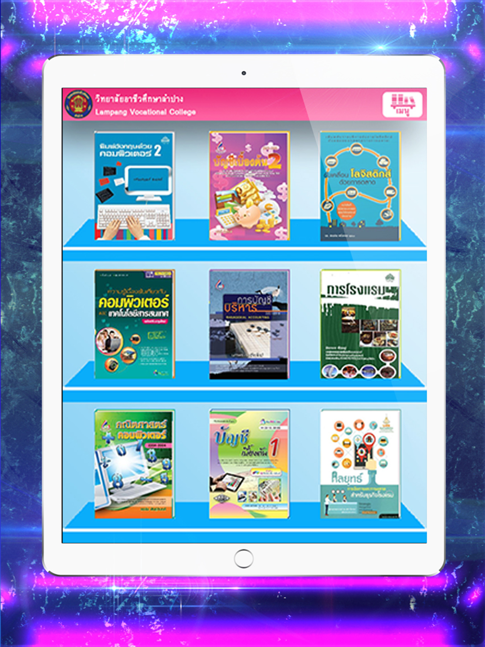 Lampang Vocational College จัดทำแอฟห้องสมุดดิจิทัลของโรงเรียน ผู้ใช้สามารถจัดเก็บและจัดเรียงประเภทของหนังสือเพื่อง่ายต่อการใช้งาน เช่น หนังสือ; นิตยสาร; หนังสือพิมพ์; อัลบั้มภาพและแคตตาล็อก ผู้ใช้สามารถที่จะเลือกรูปแบบการแสดงได้หลากหลาย เช่น การแสดงแบบปก, การแสดงแบบสัน และการแสดงแบบรายละเอียด เพื่อง่ายต่อการเลือกหนังสือโปรแกรมมีฟังก์ชันการค้นหาชื่อหนังสือ , ชื่อผู้แต่ง และชื่อสำนักพิมพ์ รูปแบบการเปิดอ่านเป็นเหมือนการพลิกหน้าหนังสือจริง ผู้ใช้สามารถซูม-ย่อขยายเนื้อหาได้