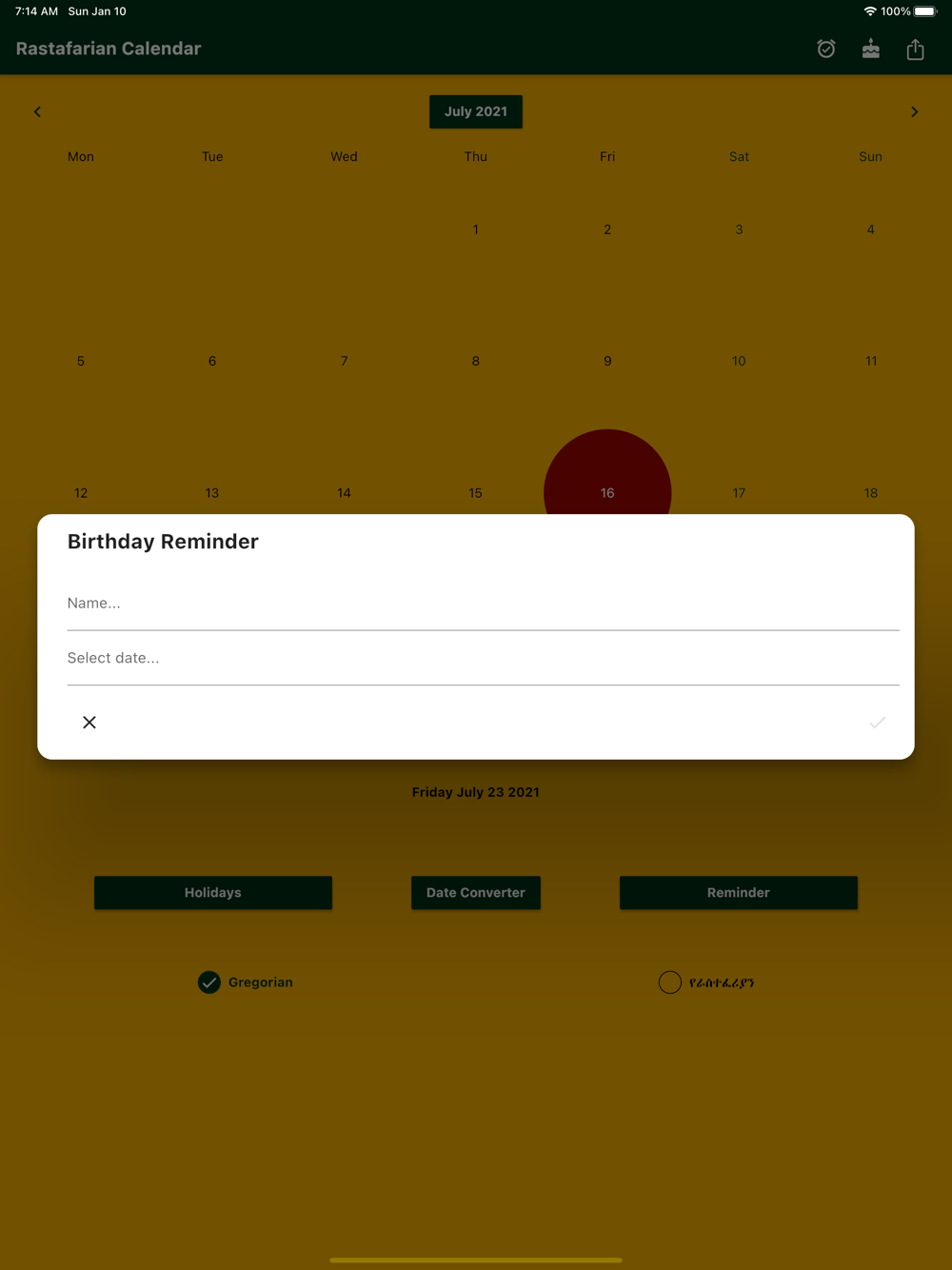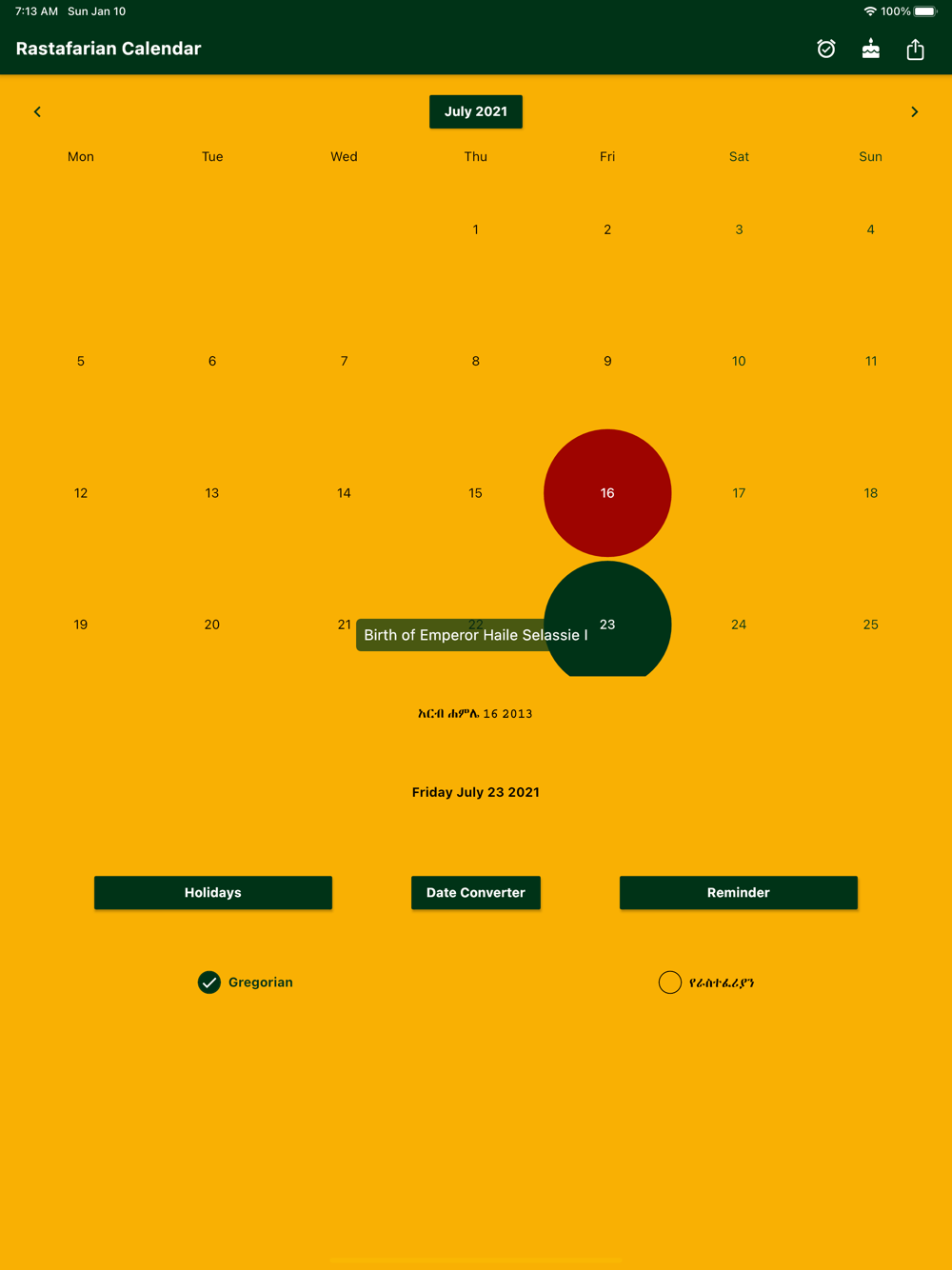 Rastafarian calendar shows Rastafarian holidays & converts between Rastafarian & Gregorian Dates!
