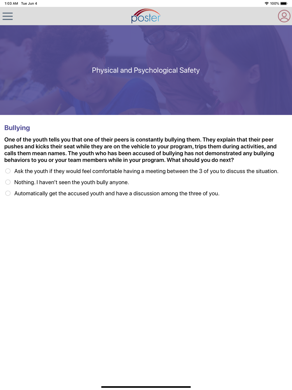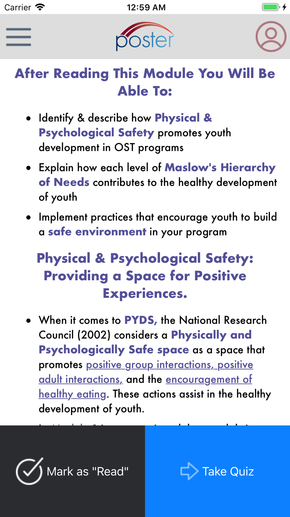Positive Out of School Time Enrichment Resources (POSTER) is an app designed for Out of School Time professionals with the goal of increasing program quality through a variety of tools and resources based on Positive Youth Development best practices. Tools and resources include a self-assessment, modules, scenarios, quizzes, and much more! With the development of a mobile platform, more youth care professionals can access the proper tools, resources, and professional development opportunities needed to increase program quality, while investing in their own development as youth care professionals.