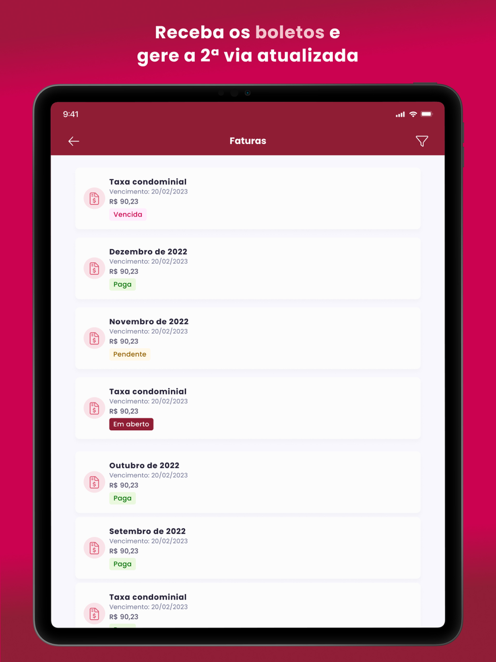 • FATURAS: Receba a taxa condominial pelo app e com 1 clique copie o código de barra para pagar em seu Internet Banking. Venceu? Sem problemas: gere a 2ª via e pague na hora! Chega de boletos em baixo na porta ou horas no telefone para gerar uma 2 via.