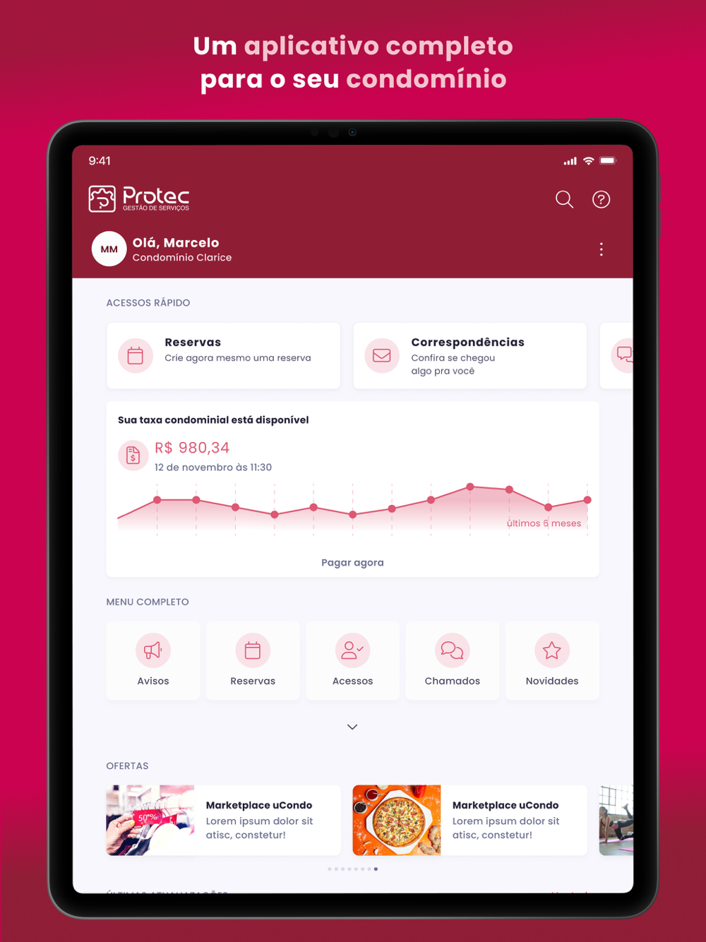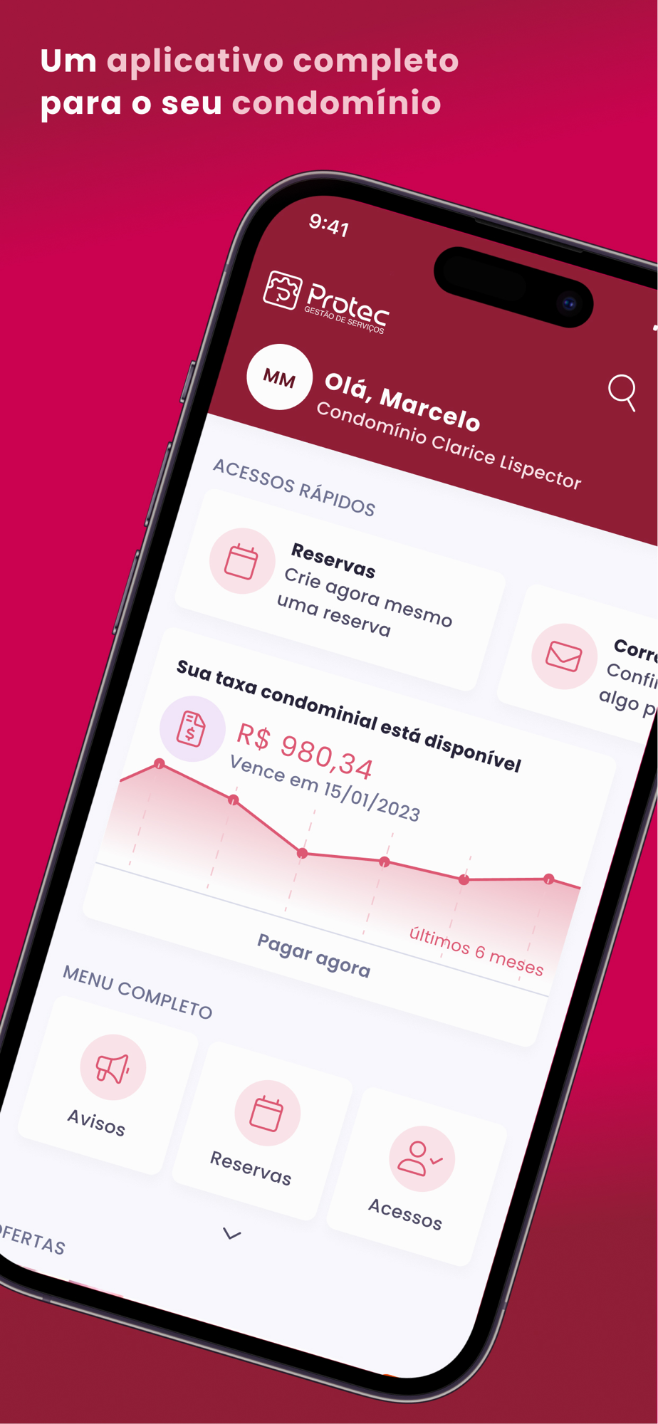• RESERVAS: Moradores realizam reservas dos espaços comuns (churrasqueiras, salão de festas…) através do app Protec. Chega de ligar na portaria ou síndico para consultar a agenda dos espaços.