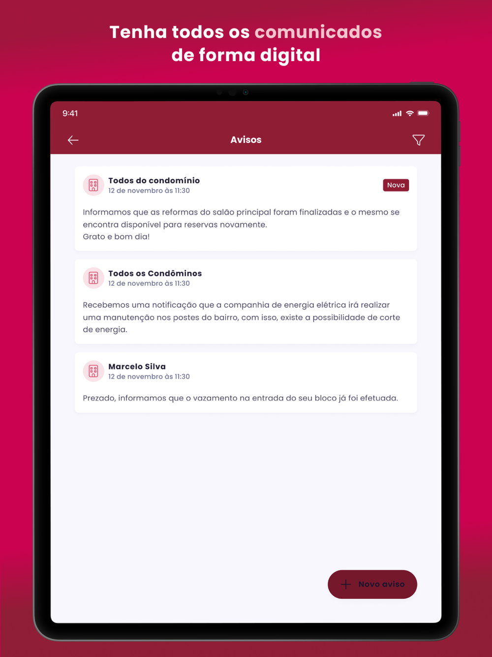 • MANUTENÇÕES: Fique por dentro de quando irá acontecer aquela limpeza da Caixa D'Água e se programe para as manutenções do condomínio. Síndicos se organizam com as demandas do condomínio. Chega de transtornos e falhas de comunicação em manutenções.