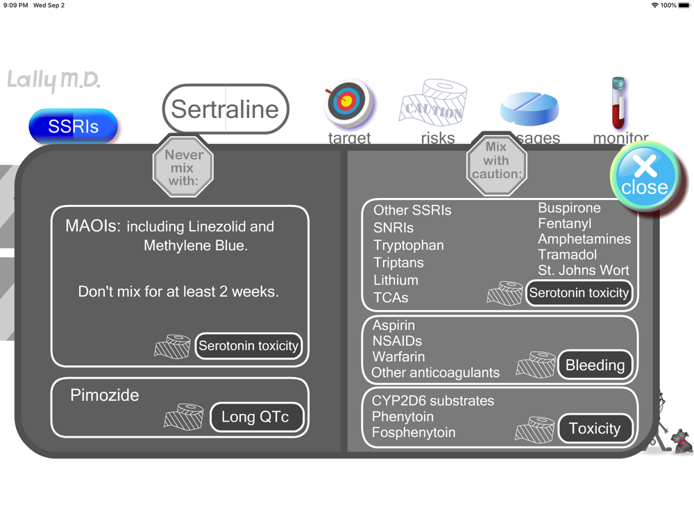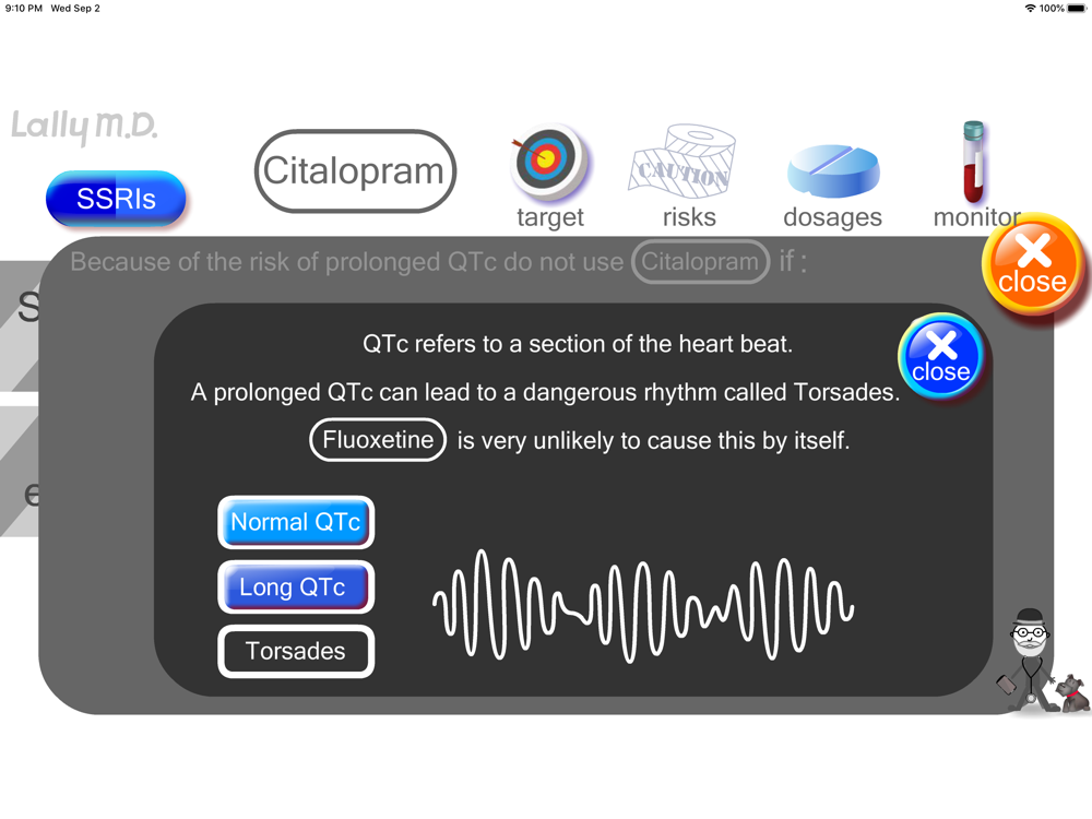 This is an animated guide to SSRI medications. It is intended for mental health clinicians but could also be a reference for patients too. It has video-game/touch-screen graphics but it is based on medical recommendations by the FDA. It covers important topics like: risks in pregnancy, cardiac risks, and drug-drug interactions.