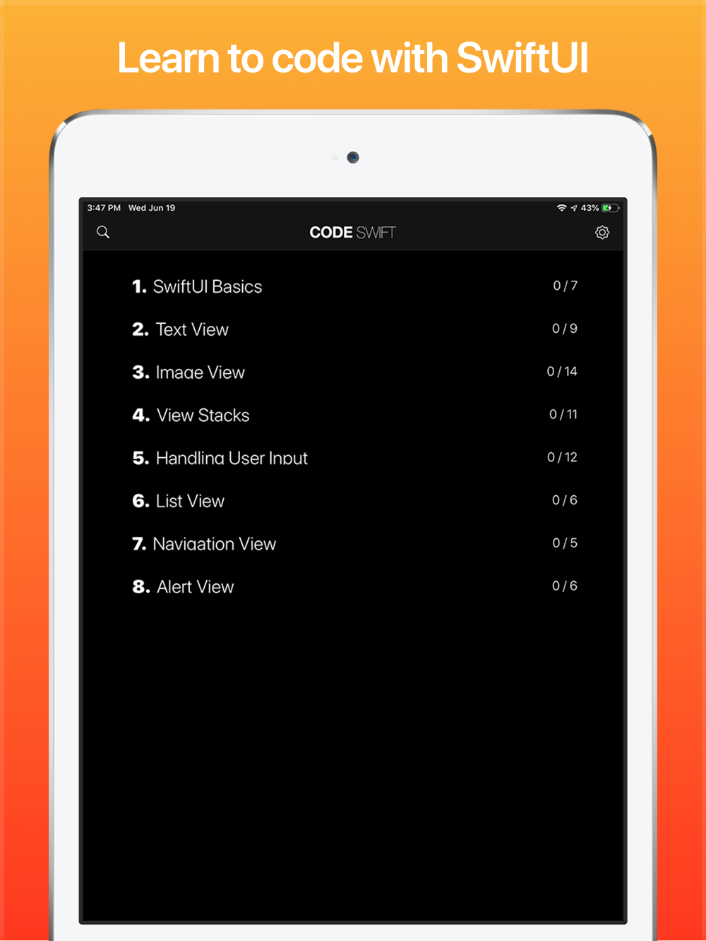 Code Swift offers you 6 SwiftUI courses with bite-sized lessons where you have to write your own Swift code using the SwiftUI framework! You will be amazed how fast you can learn to SwiftUI! Code Swift starts with the basics of SwiftUI and assumes you have no prior experience. Code Swift is also a great resource for intermediate to advanced users because it makes it super quick and easy to instantly search for and review tutorials and code snippets for a huge variety of SwiftUI topics.