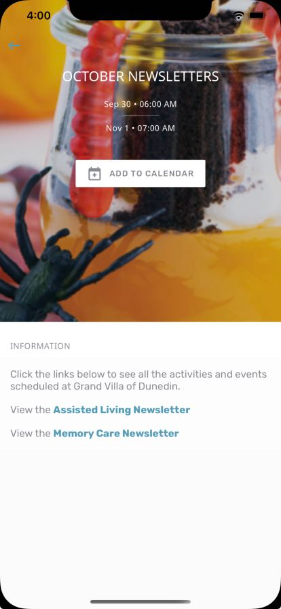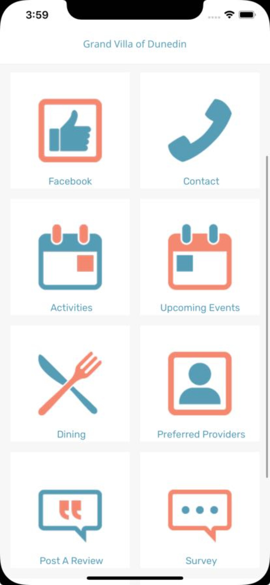 Our interactive phone app allows families to stay in constant contact with Grand Villa of Dunedin and always know what's going on in the community. App includes: Pictures, Photos, Events, Newsletter, Menu, Contacts, Feedback, and more!