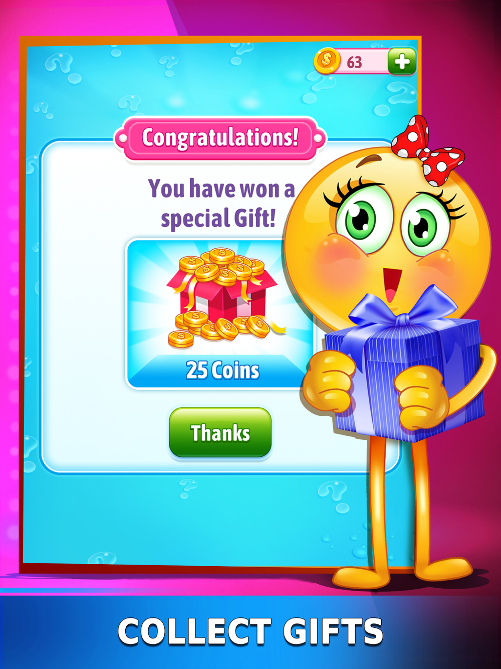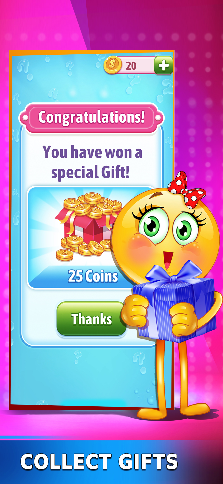 Compete with players all around the globe and solve as many phrases as you can in limited time while your challengers attempt to outsmart you. Beat them and boast your messaging & emoji puzzle mania game knowledge in one of the most challenging and visually appealing trivia games! Have fun with one of the best puzzle games on mobile.