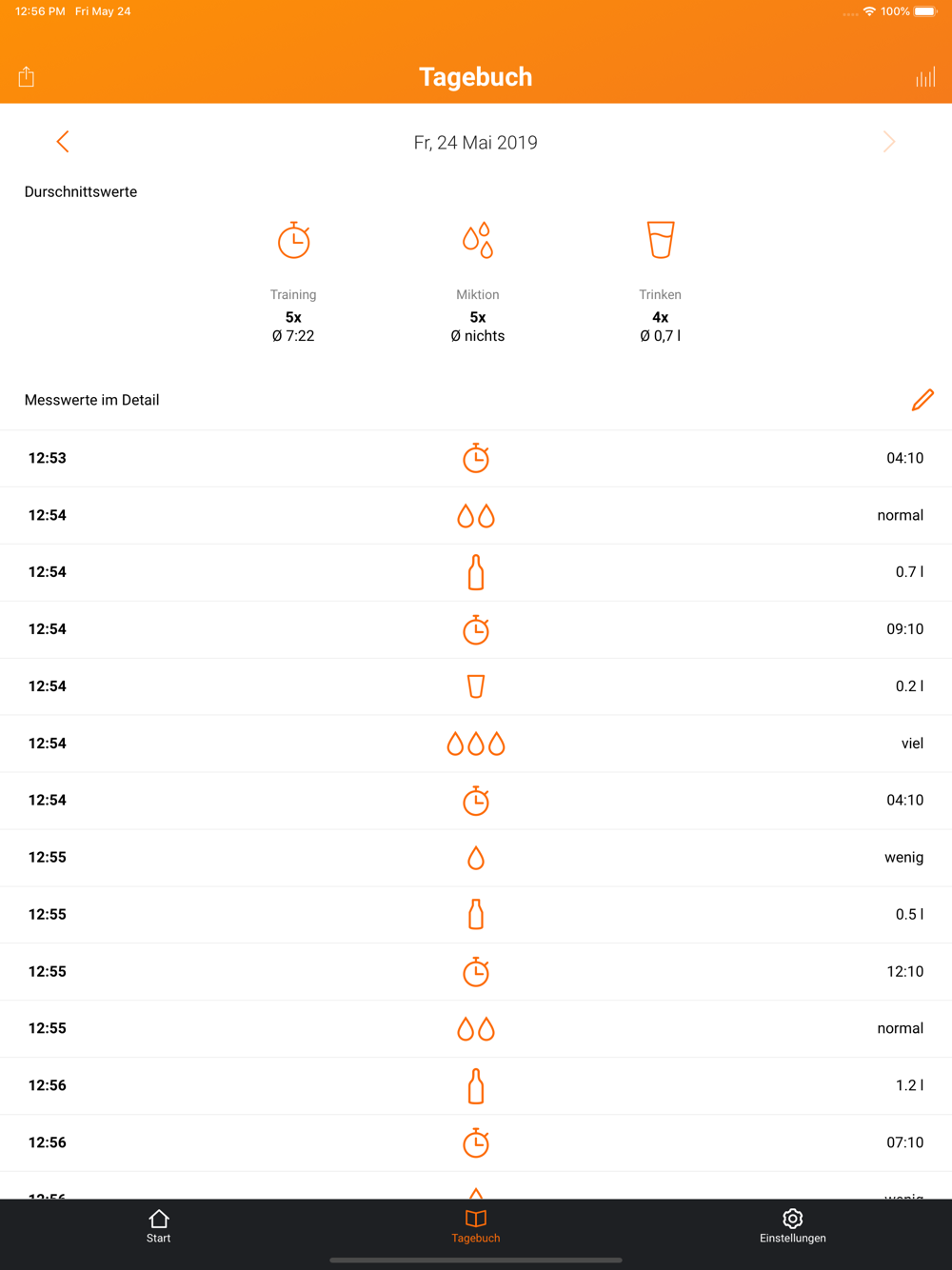 Im Miktionstagebuch dokumentieren Sie die geschätzten Urinmengen sowie Trinkmengen. Dank leicht verständlicher Symbole ganz einfach, nebenbei und unauffällig. Das Tagebuch können Sie per E-Mail downloaden und so die Ergebnisse mit Ihrem Arzt besprechen. Ihr Arzt hat damit die optimale Datengrundlage, um eine weiterführende Therapie optimal auf Sie anzupassen.