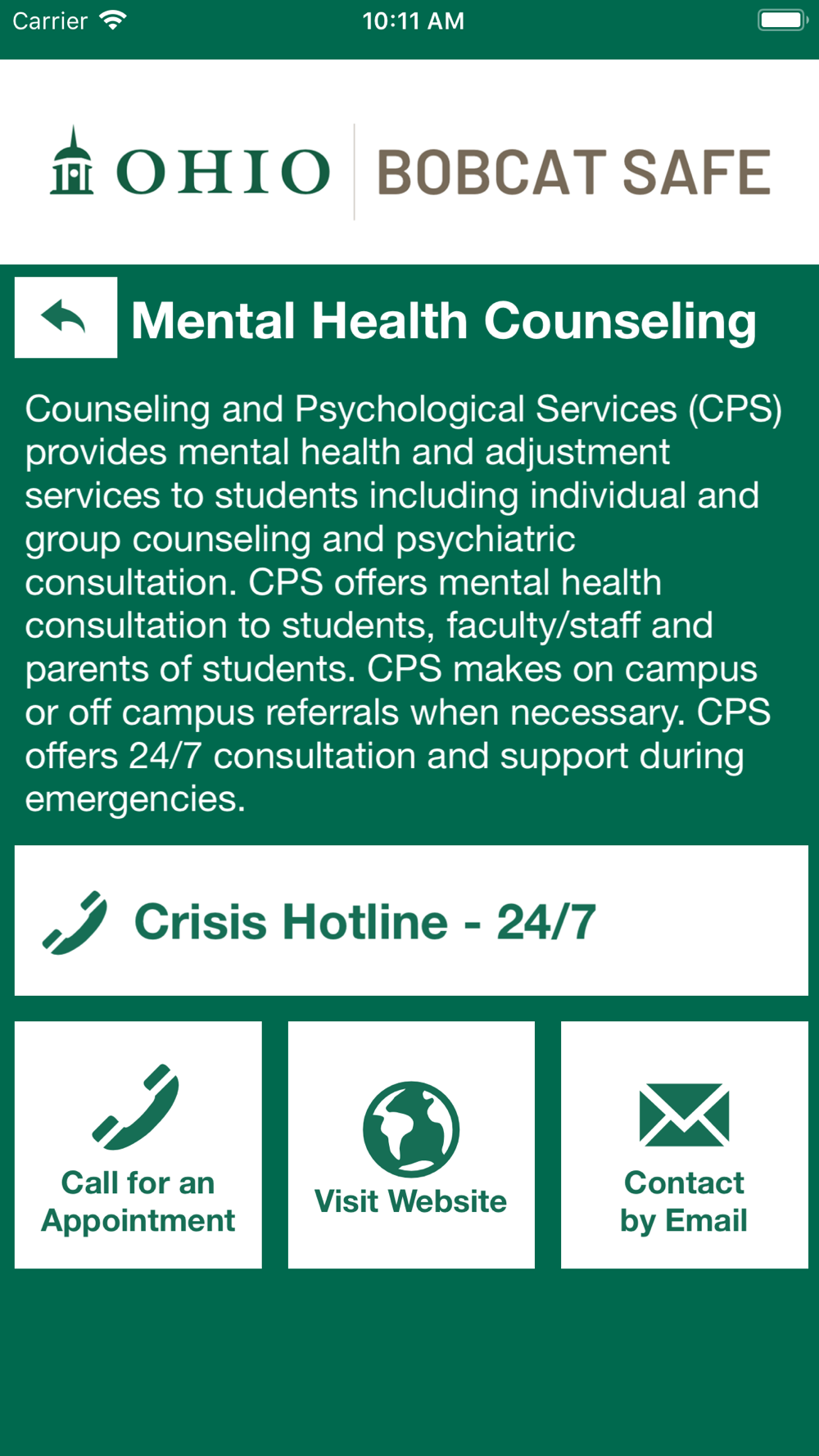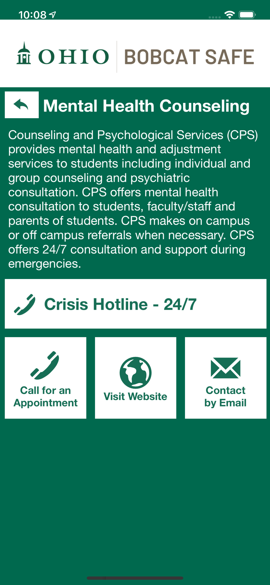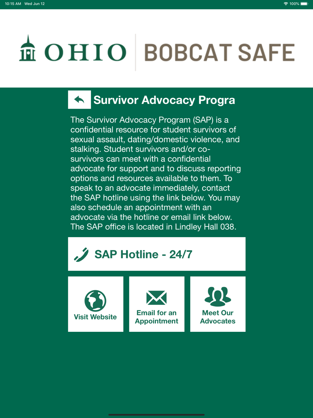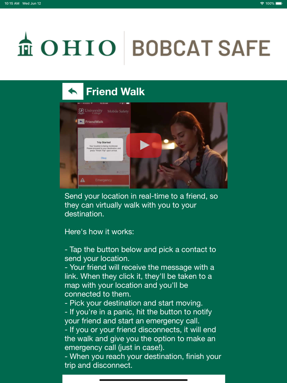 Bobcat Safe is the official safety app of Ohio University. It is the only app that integrates with Ohio University's safety and security systems. Ohio University Police Department has worked to develop a unique app that provides students, faculty and staff with added safety on the Ohio University campus. The app will send you important safety alerts and provide instant access to campus safety resources.