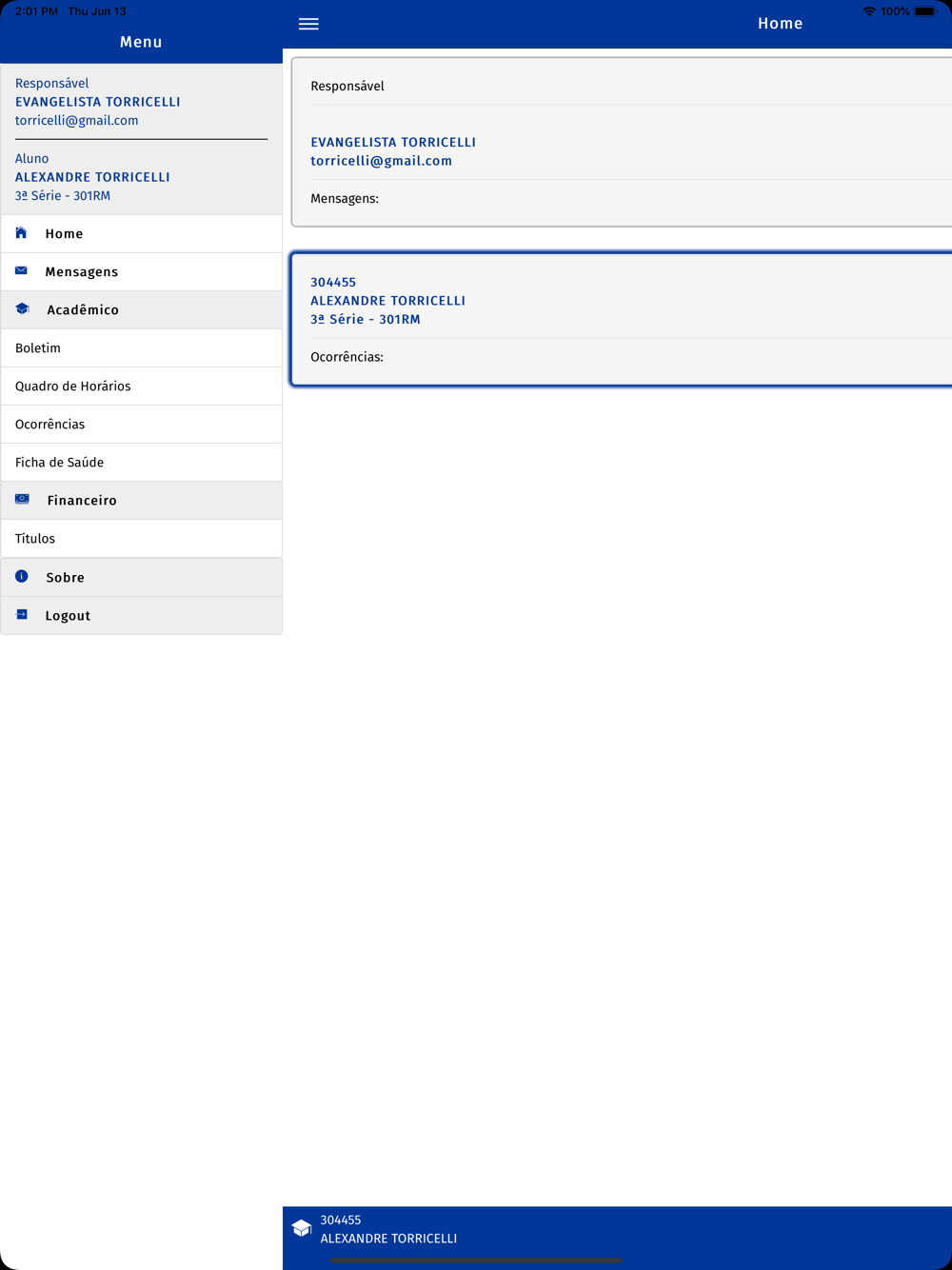 Aplicativo completo, para consulta de informações acadêmicas e financeiras, acessível para responsáveis (pedagógico/financeiro) e alunos, onde é possível: