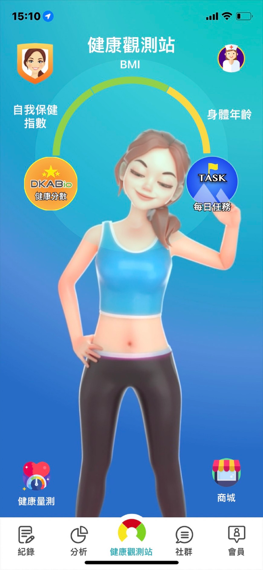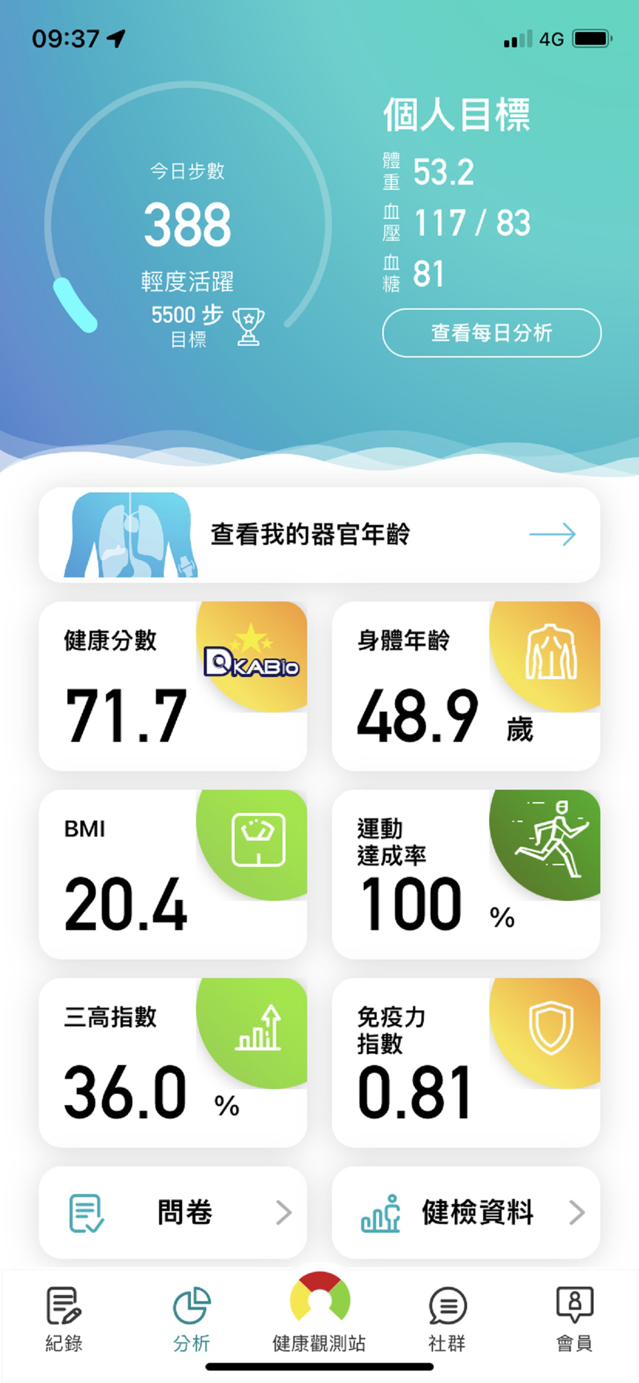 量測數據體重、血壓及血糖進行每日風險快篩,透過問卷了解個人健康認知及基本生活指標,採用簡單、易懂的燈號方式呈現,方便使用者即時了解個人化健康狀態。