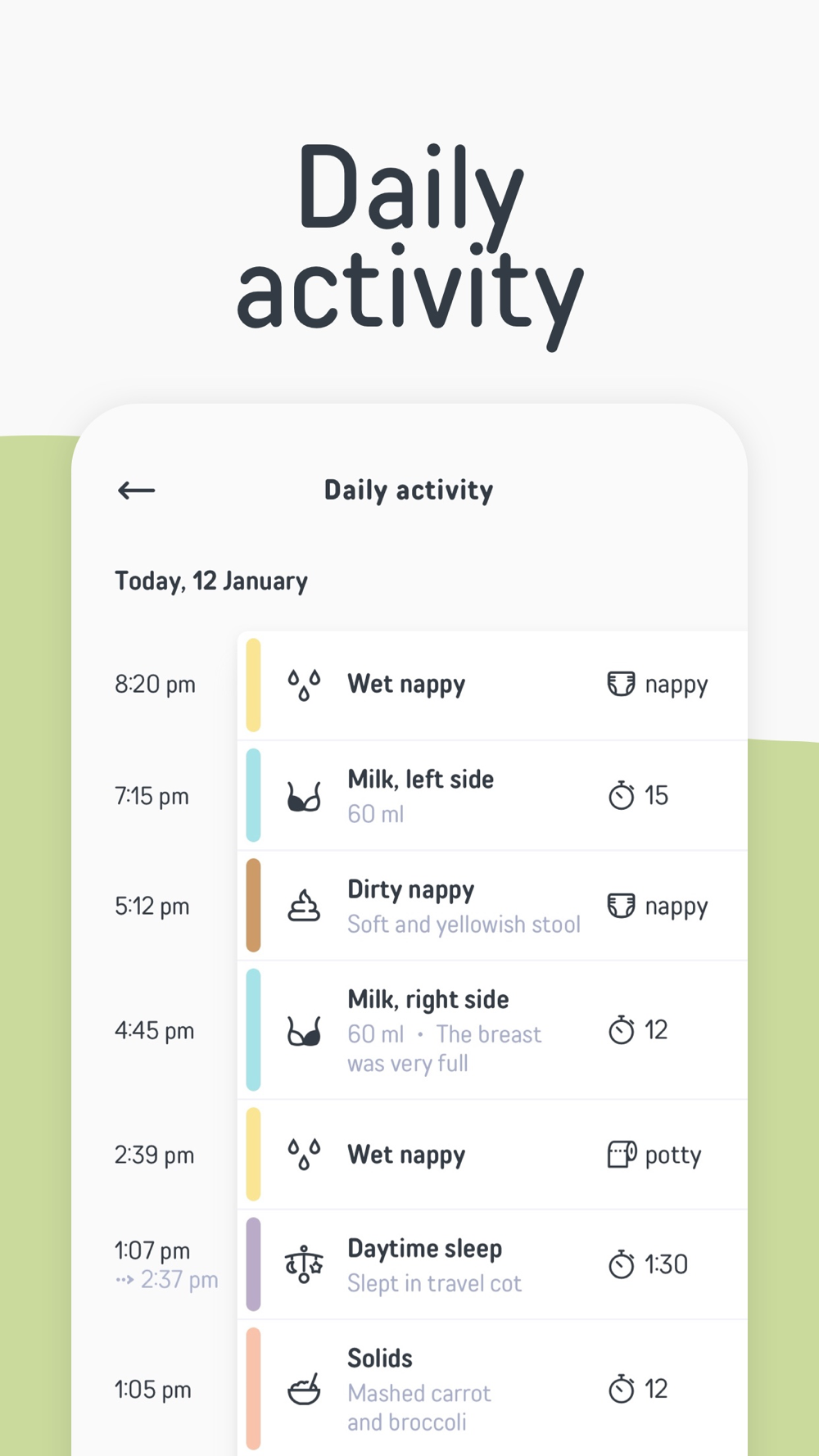 Record your baby's day time and night time sleeping patterns. Ideal for establishing and sticking to your baby’s sleeping routines.