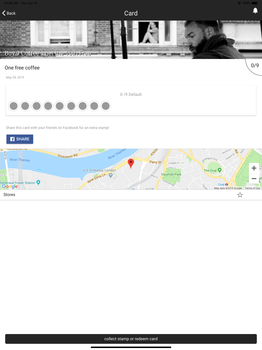 Use this app to collect loyalty stamps and earn rewards! All you have to do is push the big black button titled "collect a stamp" to collect your loyalty stamps and earn a free coffee.