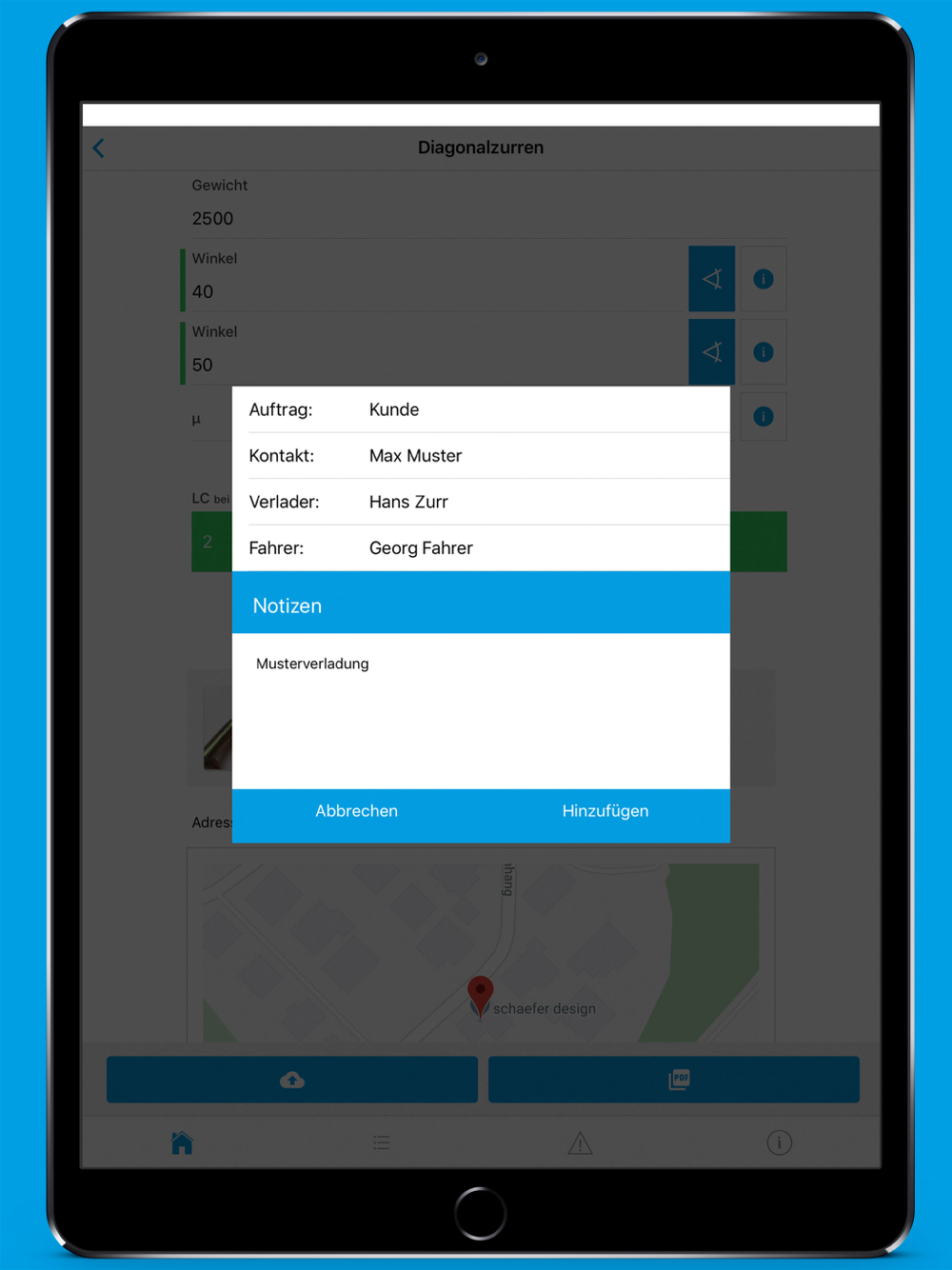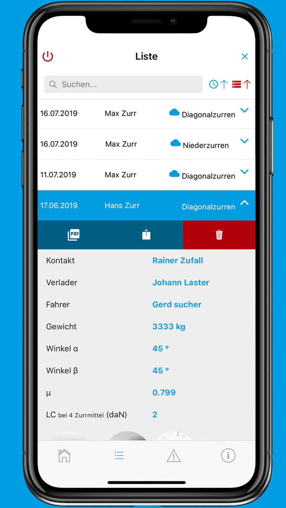 After activating the PRO option, you can save the calculations completed by you. You can add images, audio and video files to the calculations. Moreover, you may determine the location of any calculation via GPS. The calculations may be backed up as PDF files or on the server made available by Brugg Lifting AG. In order use the backup feature, you need to register with Brugg Digital.