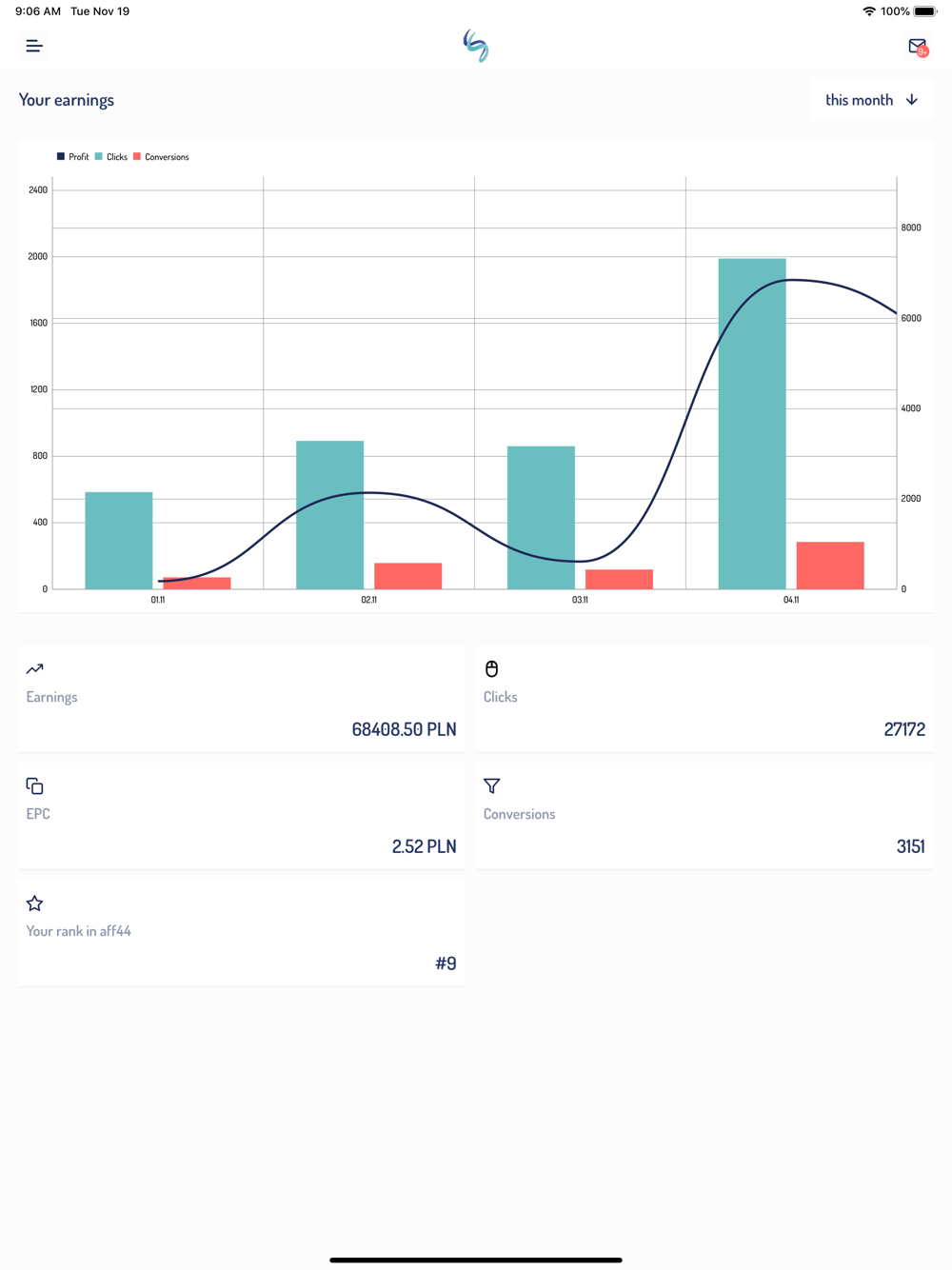 aff44 app is created for the publishers of aff44 affiliate network. With its help, you'll be able to check your stats in a fast and esay way, you'll learn which campaigns convert the best and you'll be able to keep up with all the latest news. Thanks to the push notifications you won't miss any important updates and you'll be able to track your daily earnings to better plan your promotional activities.