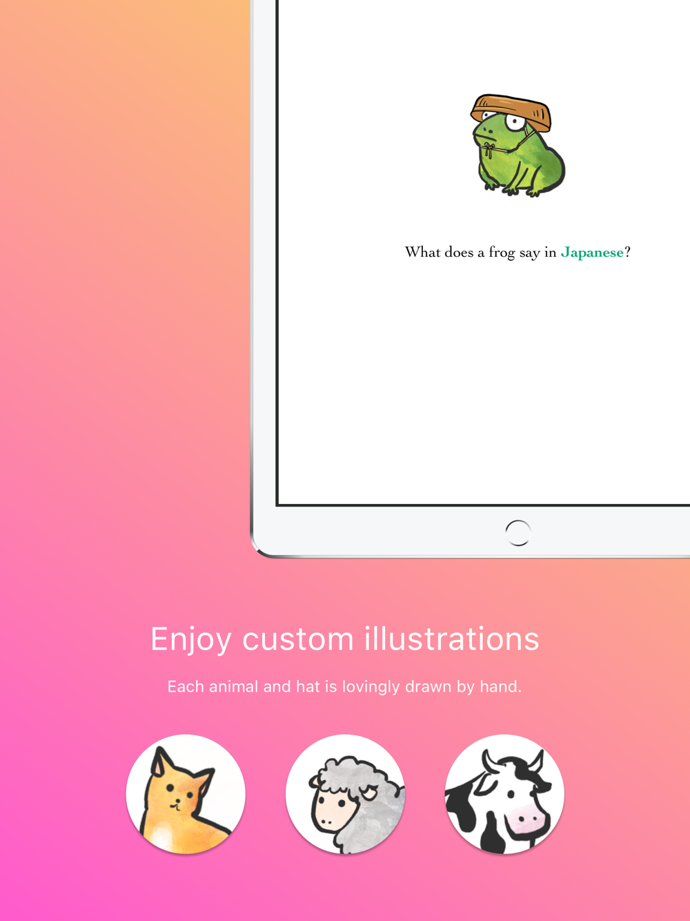 WorldAnimals is originally inspired by the creator's experience of studying the Japanese language while living in Japan for a year. One of the best experiences was learning Japanese animal onomatopoeia, and the instructor asking classmates from different countries what the animals sounded like in their languages. The maker of WorldAnimals currently speaks English, Chinese, and Japanese with plans to learn more in the future; other languages were researched to make this app.