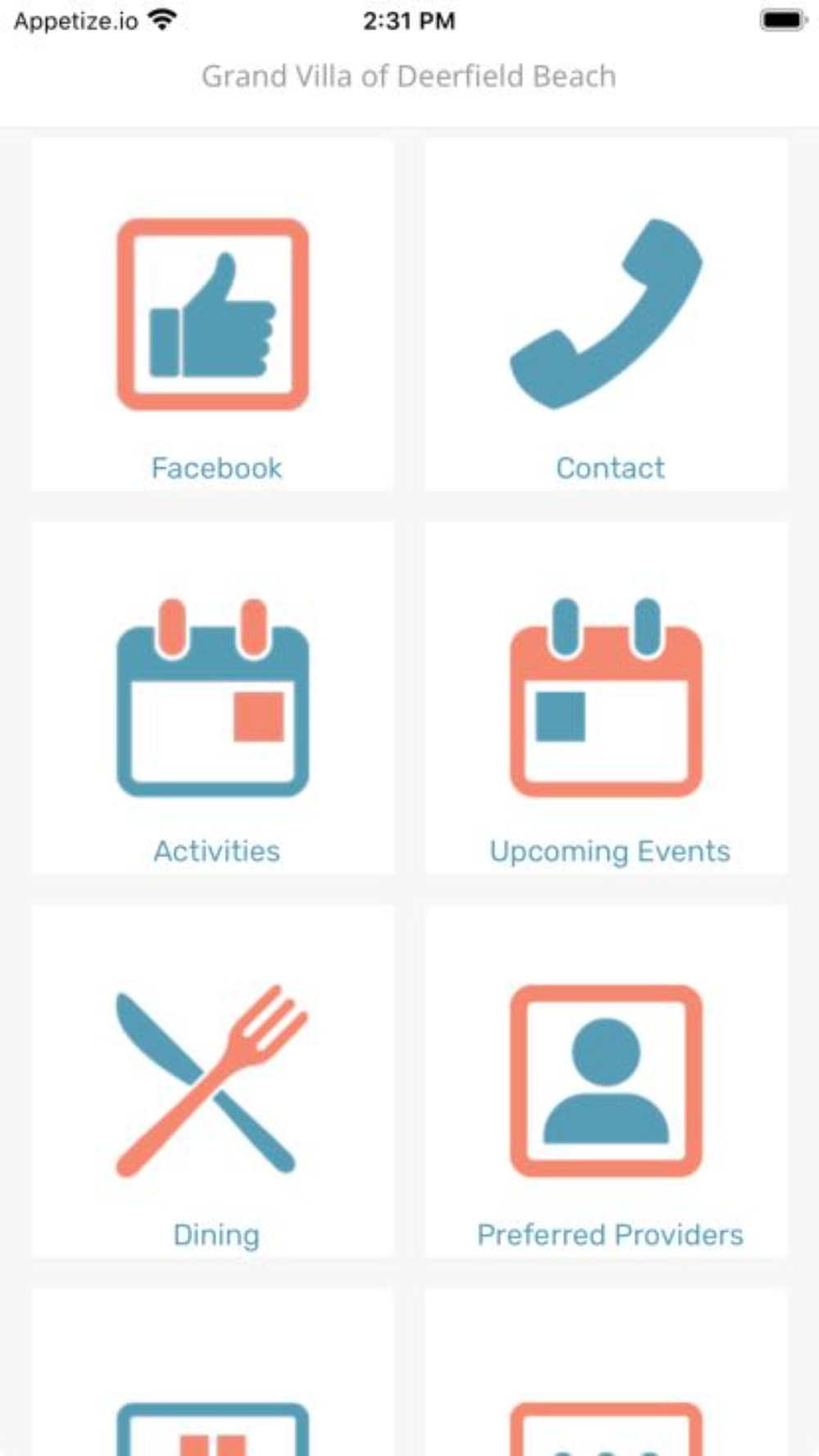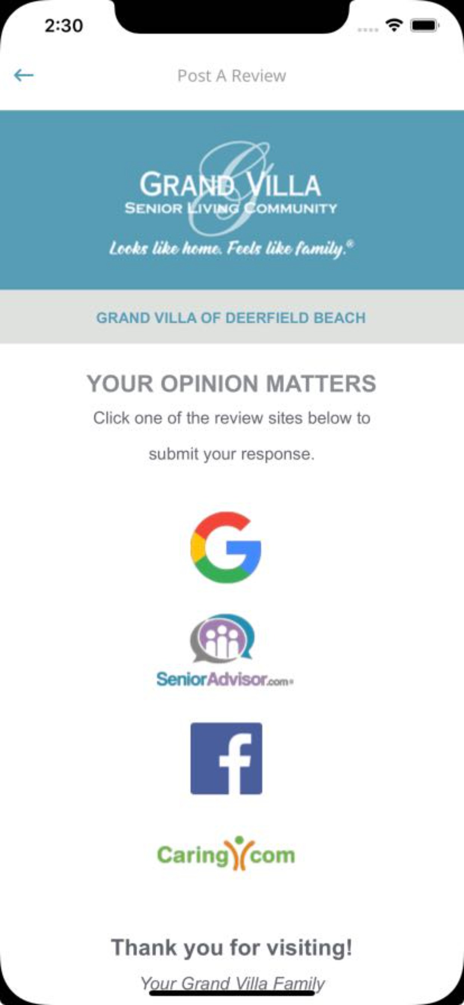 Our interactive phone app allows families to stay in constant contact with Grand Villa of Deerfield Beach and always know what's going on in the community. App includes: Pictures, Photos, Events, Newsletter, Menu, Contacts, Feedback, and more!