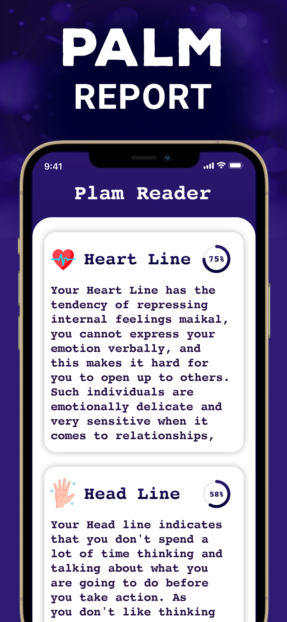 You need to first fill up your profile details and then scan up your palms. Scanned photo is stored only on your phone. Palm Reader analyses how each of your lines interacts with other lines and mounts, how your psychic energy flows along them.