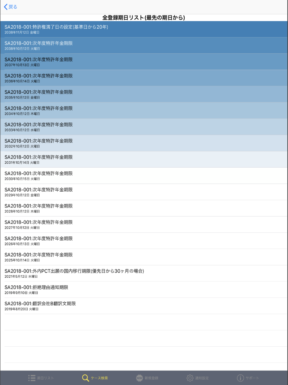 知財に関わる実務者(弁理士、特許技術者、特許事務所員、企業知財部、翻訳関連業務従事者等)が自身のスマホやiPad(今後Macでも使用可能)で手軽に便利に特許等知財業務に関わる期日を管理できるようになりました。「スマホde特許管理」では、各種期日(特許期日、企業内特許実務や翻訳業務に関連する期日)を一括管理することができます。ケース番号(必須)でケース管理します。拒絶理由通知応答期限、外内PCT国内移行期限、次年度特許年金支払い期限等の期限は半自動的に登録できるようになっています。特許庁への期限では、特許法3条に基づいて2050年までの休日の計算を行います。また、顧客名のリストを入力した後に登録しておくこともできます。期日はケースごとの全期日の一括リスト表示もできますし、本日の日付から近いものを順に期日をリストにして表示します。個々の期日についてはデバイスへの通知を期日当日と所定日前に行います。また、カレンダーへの記載も期日当日と所定日前にも書き込み期日への対応を忘れないようにしています。これらのデータは自身のiCloudプライベートデータベースへ保存しますので、セキュリティーも高いです。事務所や会社での期限管理ソフトウエアと合わせて、または、個人用にも便利に自身のスマホで一括管理することができます。iPadでも使用可能ですので、今後、Macデスクトップ上でも「スマホde特許管理」が使用できるようになる予定です。データはiCloudに保存してシェアできますので、同じAppleIDを使用することで、マルチデバイスで共同で使用することもできます。利用規約(Terms of Use)は、https://bfaaap.com/terms-of-use/ からご覧ください。