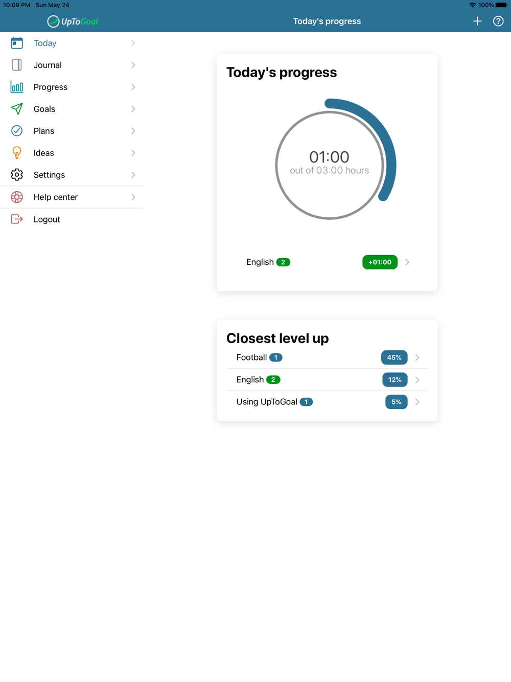 UpToGoal is a platform for self-development. Our main goal is to help people with their productivity and achieving of new goals.