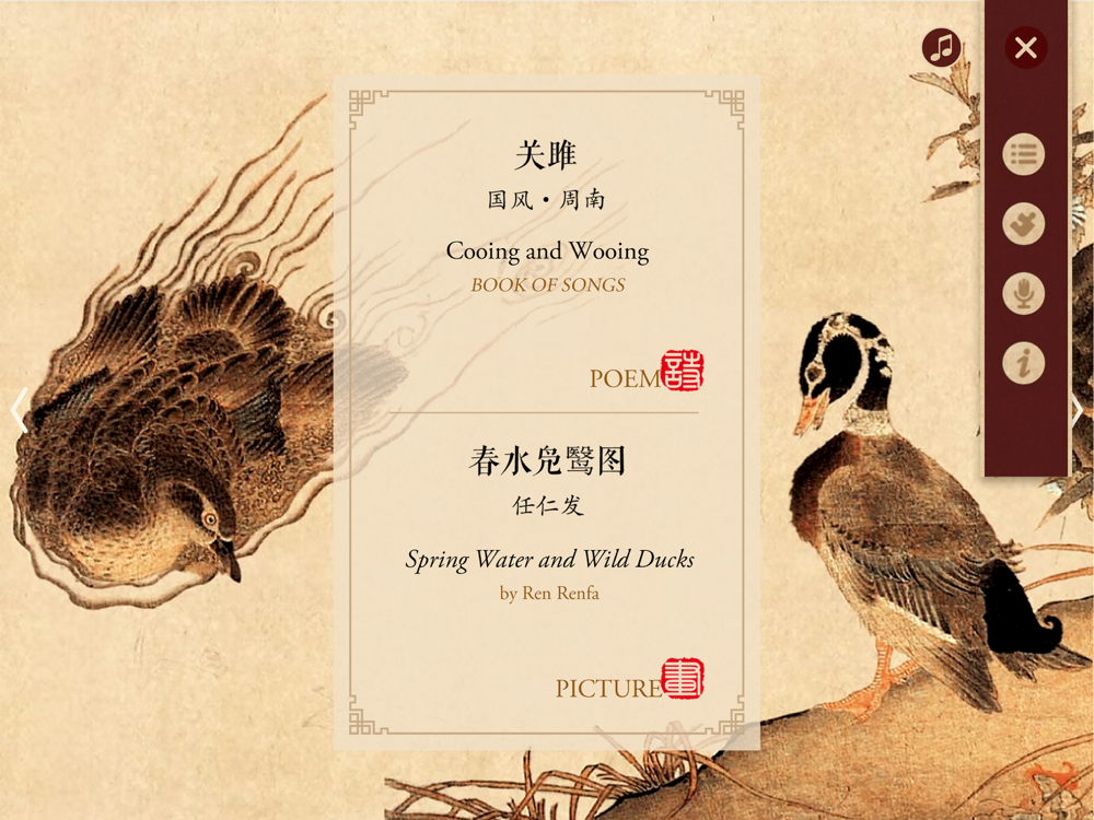 Selection from The Book of Poetry and Poetic Paintings is one of a series of app under the general title of Chinese Traditional Culture Series. This series selects 40 representative poems from The Book of Poetry in Chinese with Romanized pinyin notes and English translations. All paintings in the book help deepen the understanding of the poems of The Book of Poetry. The adoption of audio, animation and interactive games in this app allows readers to enjoy the contents by use of both their eyes and ears. It also offers an opportunity to learn the Chinese language.