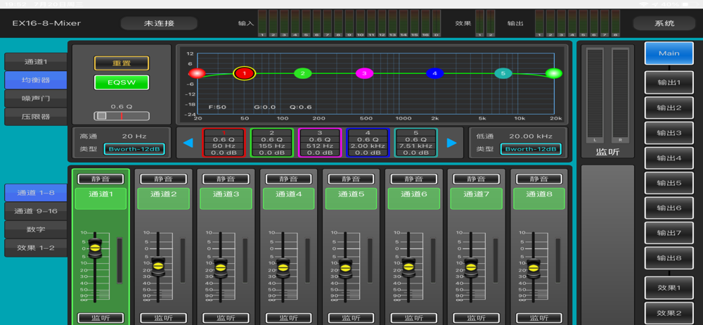 2、每路输入独立5段参量EQ可调,高低通滤波器任意分频