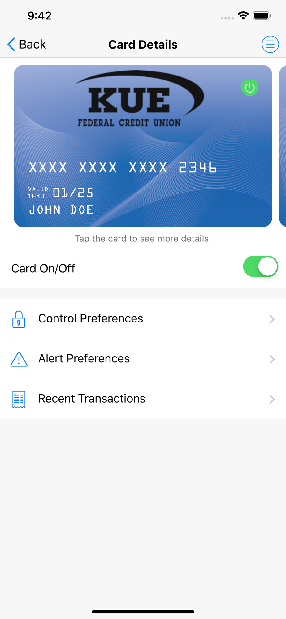When “on," transactions are allowed, per settings. When “off,” purchases or withdrawals are denied until the card is turned back "on."