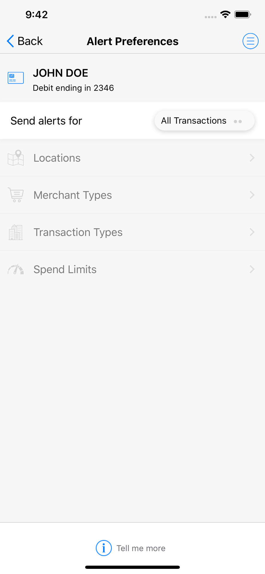 Set spending limits to decline transactions above your thresholds. Monitor activity by category, such as gas stations and restaurants, and by type: in-store purchases, e-commerce transactions and ATM transactions.