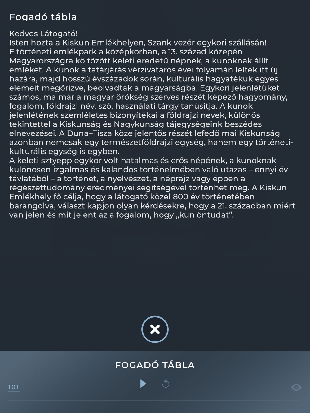 Az alkalmazás a Kiskun Emlékhely Szank Vezér Szállásán kiállítás megismertetését teszi lehetővé a látogató számára 3 nyelvű hang anyagok segítségével. A látogató helyszínpecifikus hang anyagokat tölthet le, a tájékozódásban és az információk elérésében a helyszínről készült térkép vagy lista nézet segíti.