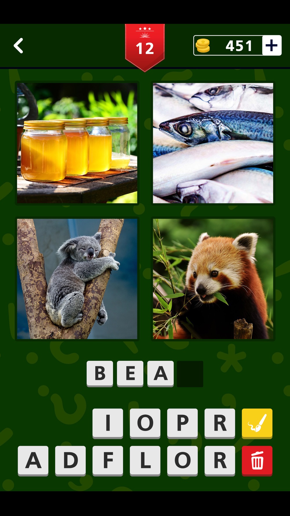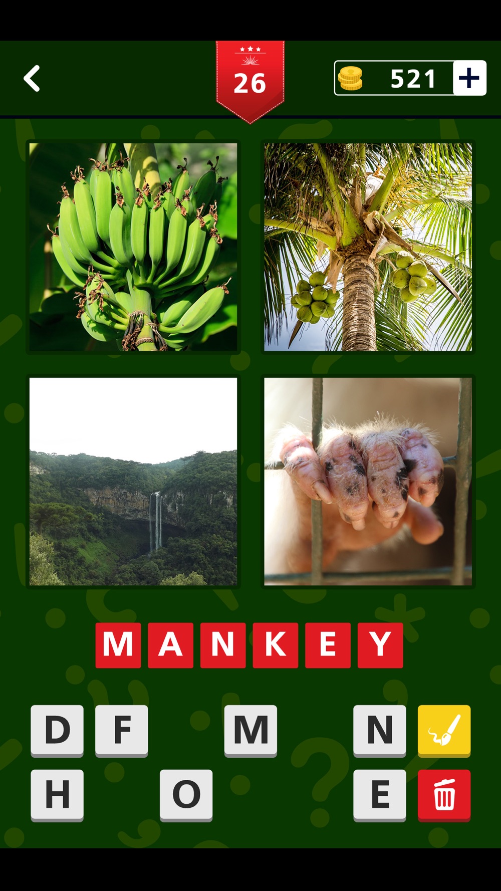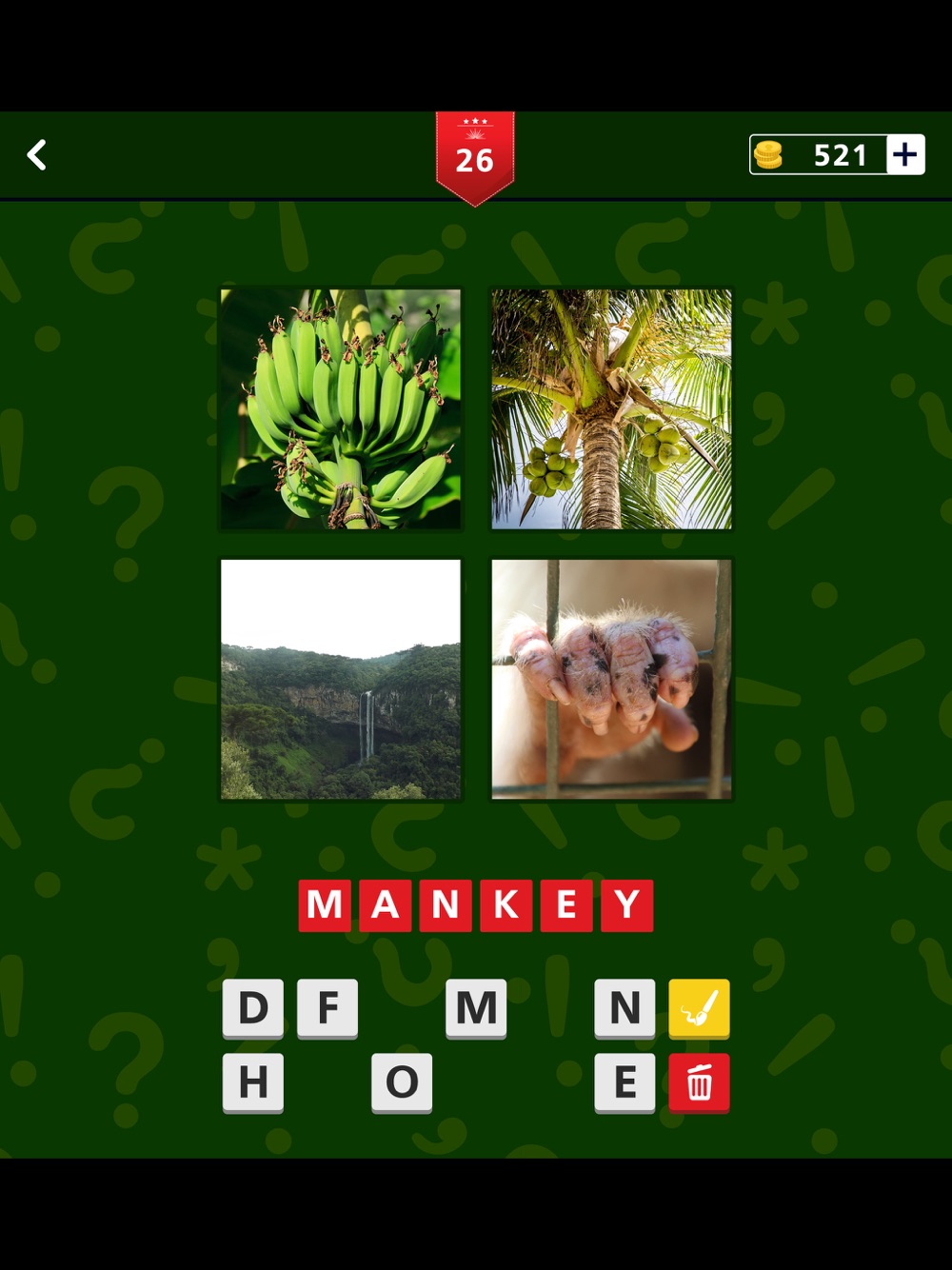 In the game 4 pictures 1 word you need to form a word from the given letters, which will describe all the four pictures. On hard and interesting levels you will find pictures chosen with special care. For every right answer you will get precious coins, which you can use to buy hints, and you’re going to need them for sure, cause the game 4 pictures 1 word is really hard.