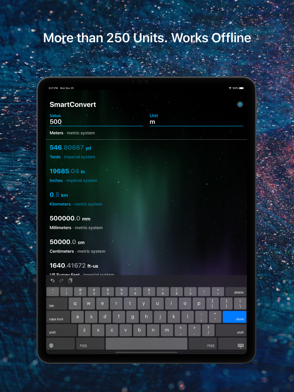 You don't have to specify which output units you want to see – we show you all the units available, sorted automatically by relevance. Want to convert metric to imperial? We'll show the same value converted in inches, feet and yards – all in the same screen. SmartConvert includes than 250 units and works offline!