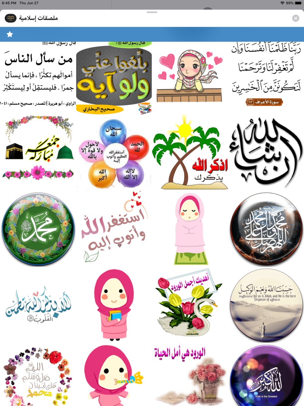 استمتع بهذه الاستكرات الإسلامية الجميلة و شاركها مع أصدقائك و أحبابك. هذا التطبيق يحتوي على ستيكرات إسلامية، احاديث، اسم سيدنا محمد، استغفارات، أذكار، ملصقات و استيكرات ٱيات قصيرة، ملصقات نصوص ومخطوطات و المزيد قادم في التحديثات المقبلة