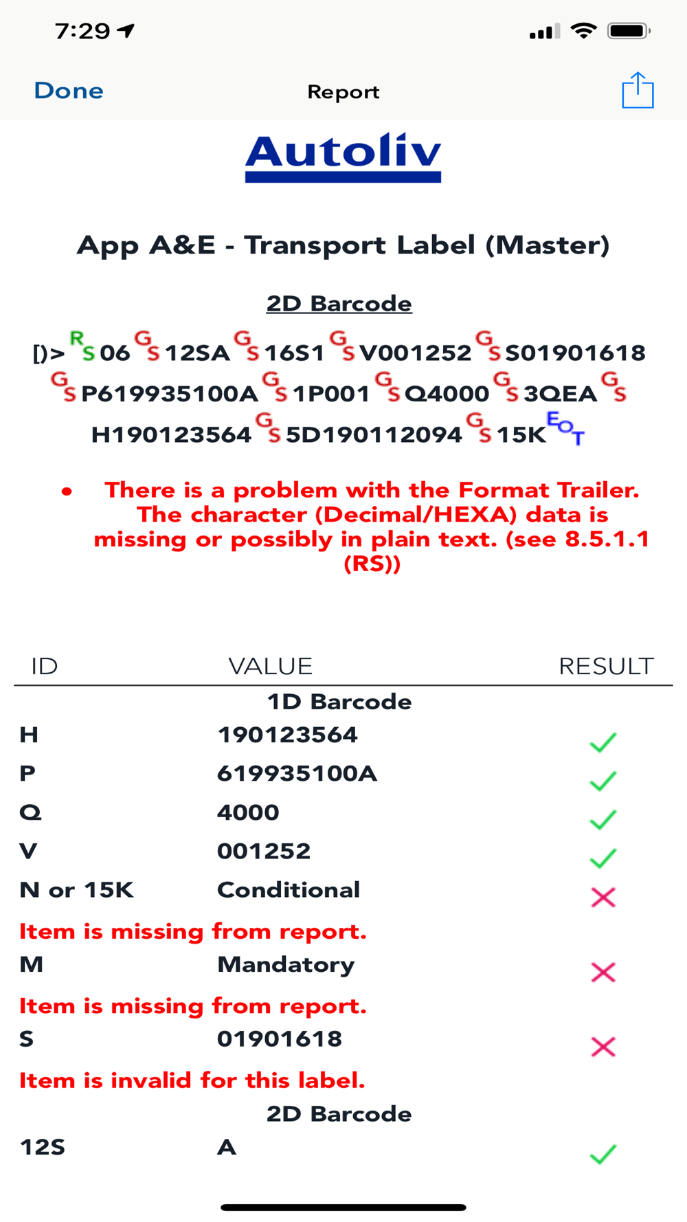 The Autoliv LabelCheck app verifies that a supplier transport or shipping label meets the requirements as documented in the AS244 specification. Using the device camera, the app compares the supplier data matrix 2D barcode versus the Autoliv 2D guideline, and 1D barcode compliancy can also be assessed. The report generated can be shared via email or text message.