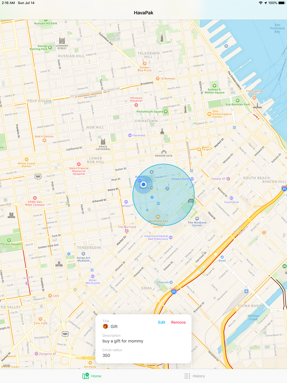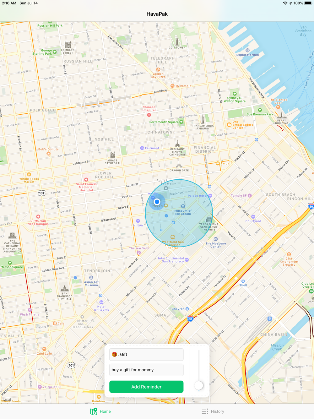 Creating reminder is quite easy, you just press and hold for a second after that, the region of location is added automatically also you can set a title, a description and a circle radius for the reminder, HavaPak send you a custom message as a notification or alert.