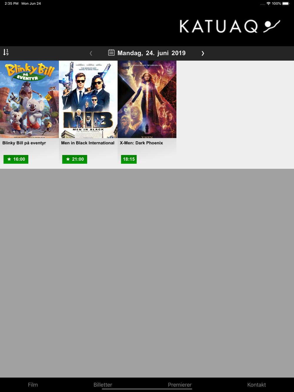 Med denne app har du mulighed for at gennemse programmet for Katuaq samt se yderligere filminformationer som trailer, censur, medvirkende skuespillere, varighed m.m.