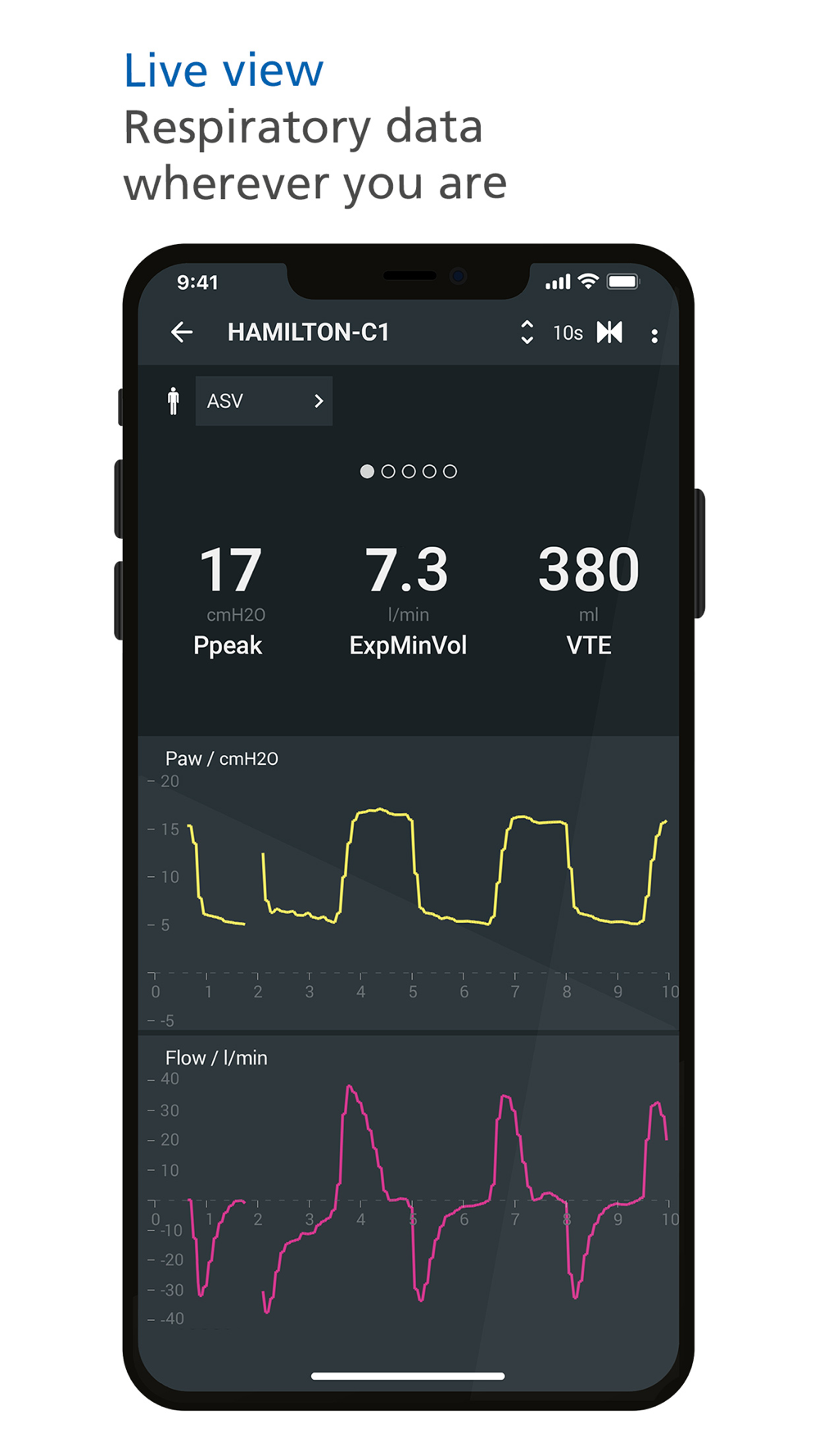 The Hamilton Connect App transforms your mobile device into a portable secondary ventilator display. It streams near real-time data from the ventilator to your mobile device, so you can review your patient’s respiratory data even when you are not within reach of the ventilator.