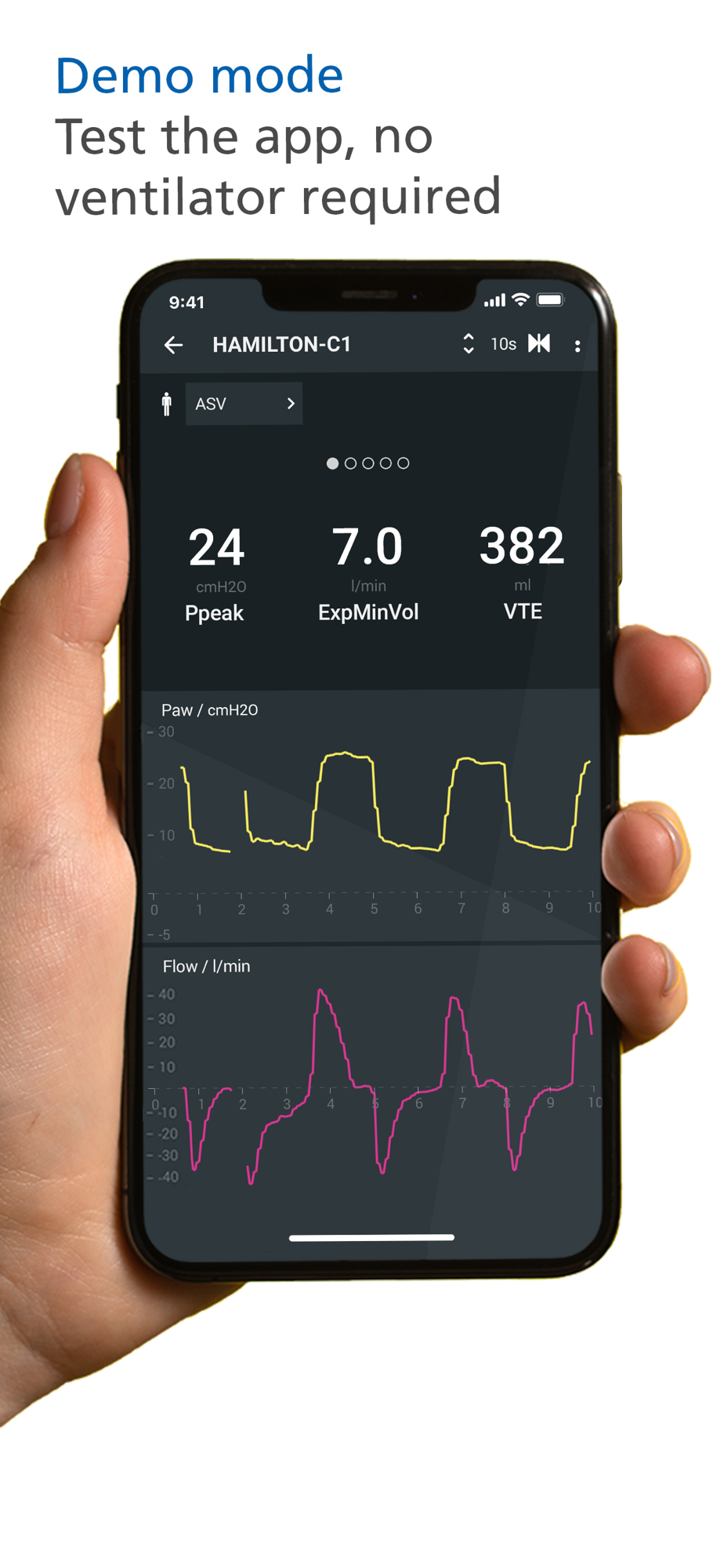 Test the app in demo mode, even without a ventilator. Explore all the features and functionalities for as long as you like.