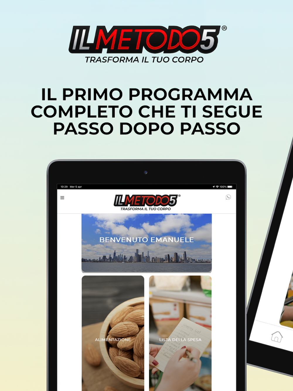 Benvenuto nella nuova app IL METODO5® creata per aiutarti a raggiungere i tuoi obiettivi di salute e benessere! La nuova app è stata progettata per fornirti tutto ciò di cui hai bisogno per ottenere il massimo dalla tua attività fisica e dalla tua dieta, aiutandoti a raggiungere risultati concreti.