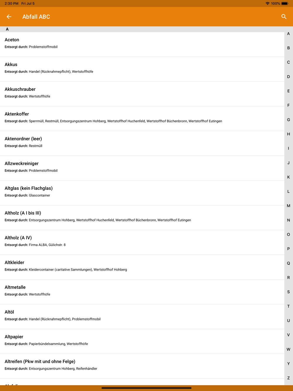 Die App verfügt ebenfalls ein ausführliches Abfall-ABC, damit Sie in Zukunft eine smarte, flexible Übersicht über sämtliche Abfälle und deren Entsorgung haben.