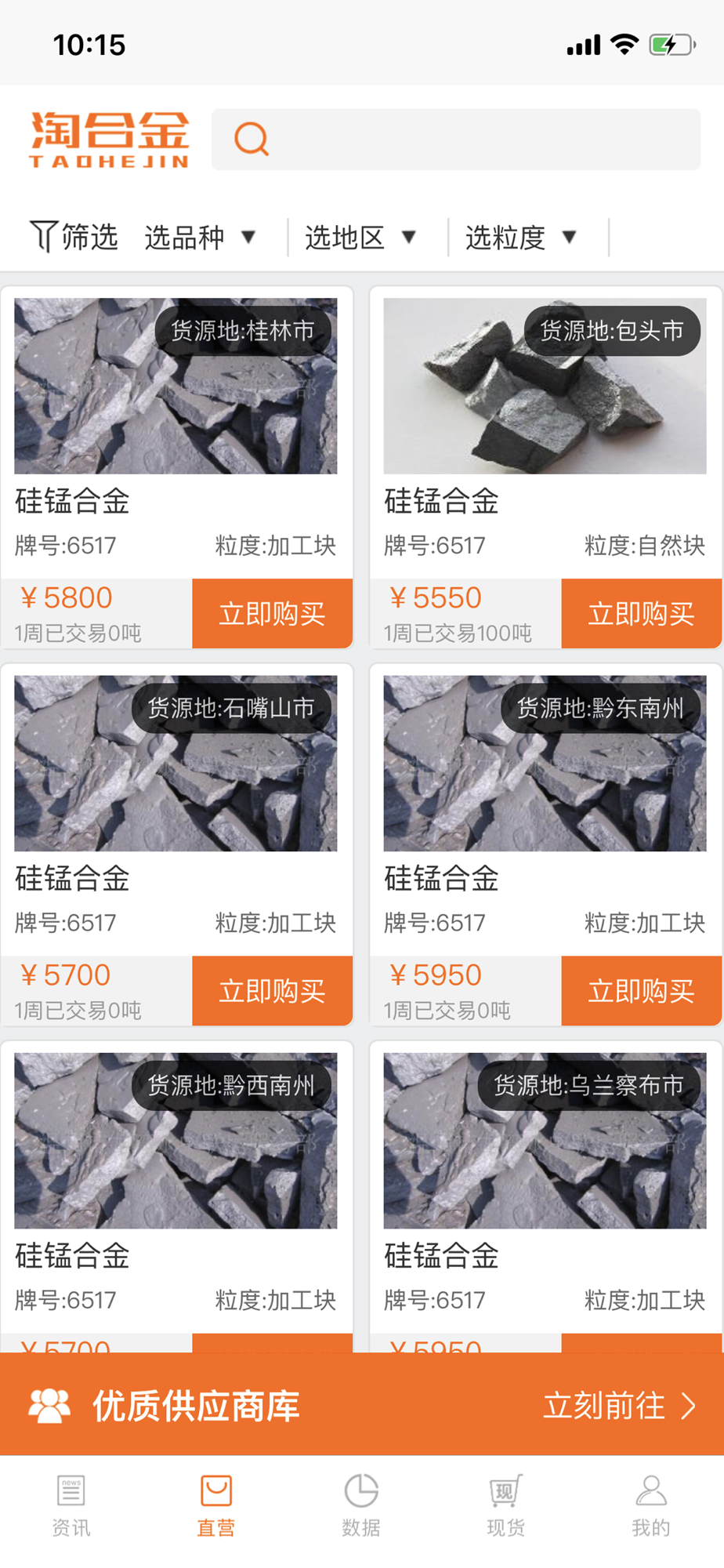 直营商城:淘合金是一家贸易与网络一体的公司,有这大量的铁合金现货资源和贸易经验,直营商城上的商品是我们淘合金直接销售给用户,用户只需要在平台上下单,我们的客服人员就会与用户对接签约合同,并且所有的流程动态都会展示在淘合金app的直营订单详情中,包括合同签订情况,物流情况,货物到场情况,淘合金平台为钢铁公司和贸易商提供价格公道、质量有保障、供货效率极高的铁合金货源。