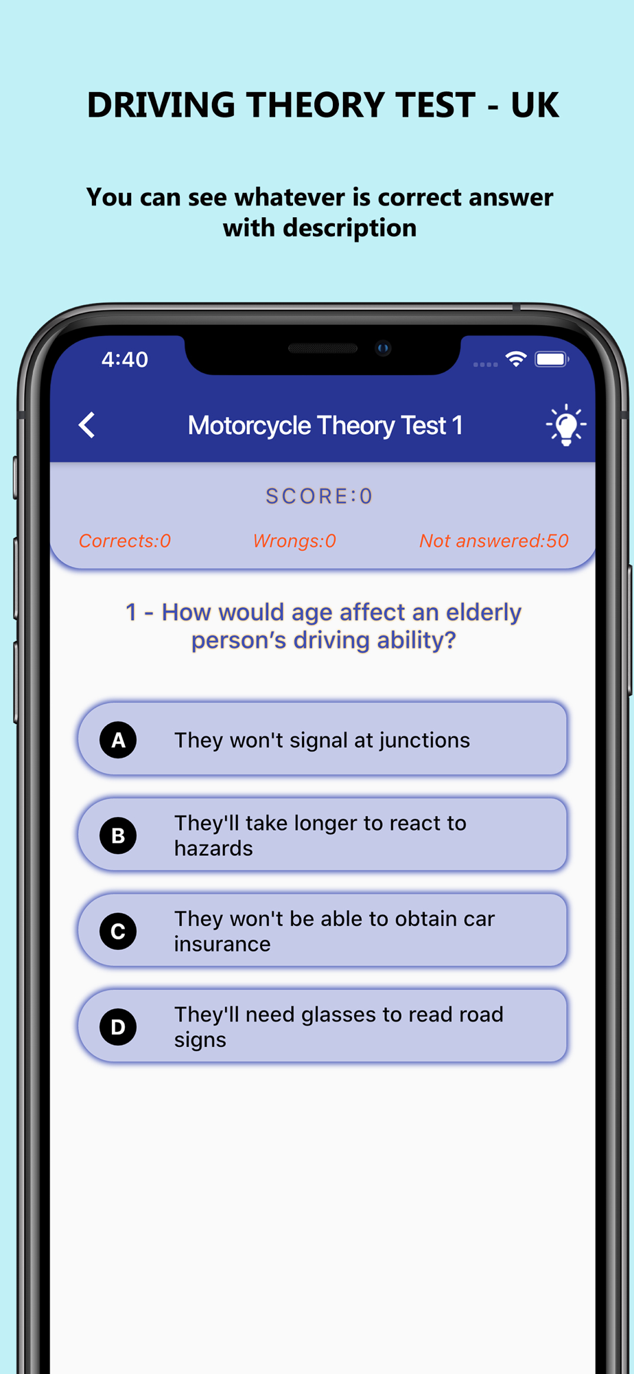 • MOTORCYCLE THEORY TEST : This driving theory test app also provides best practice test for motorcyclists and moped riders.