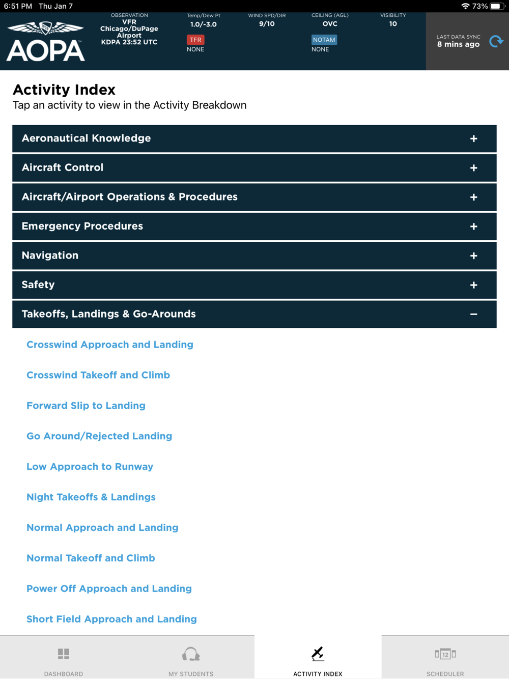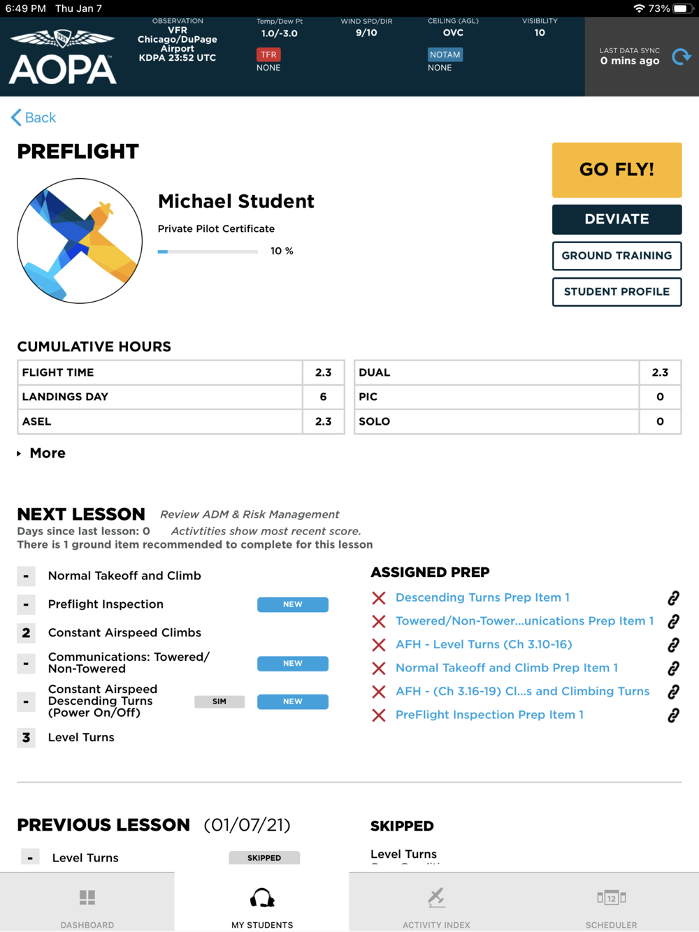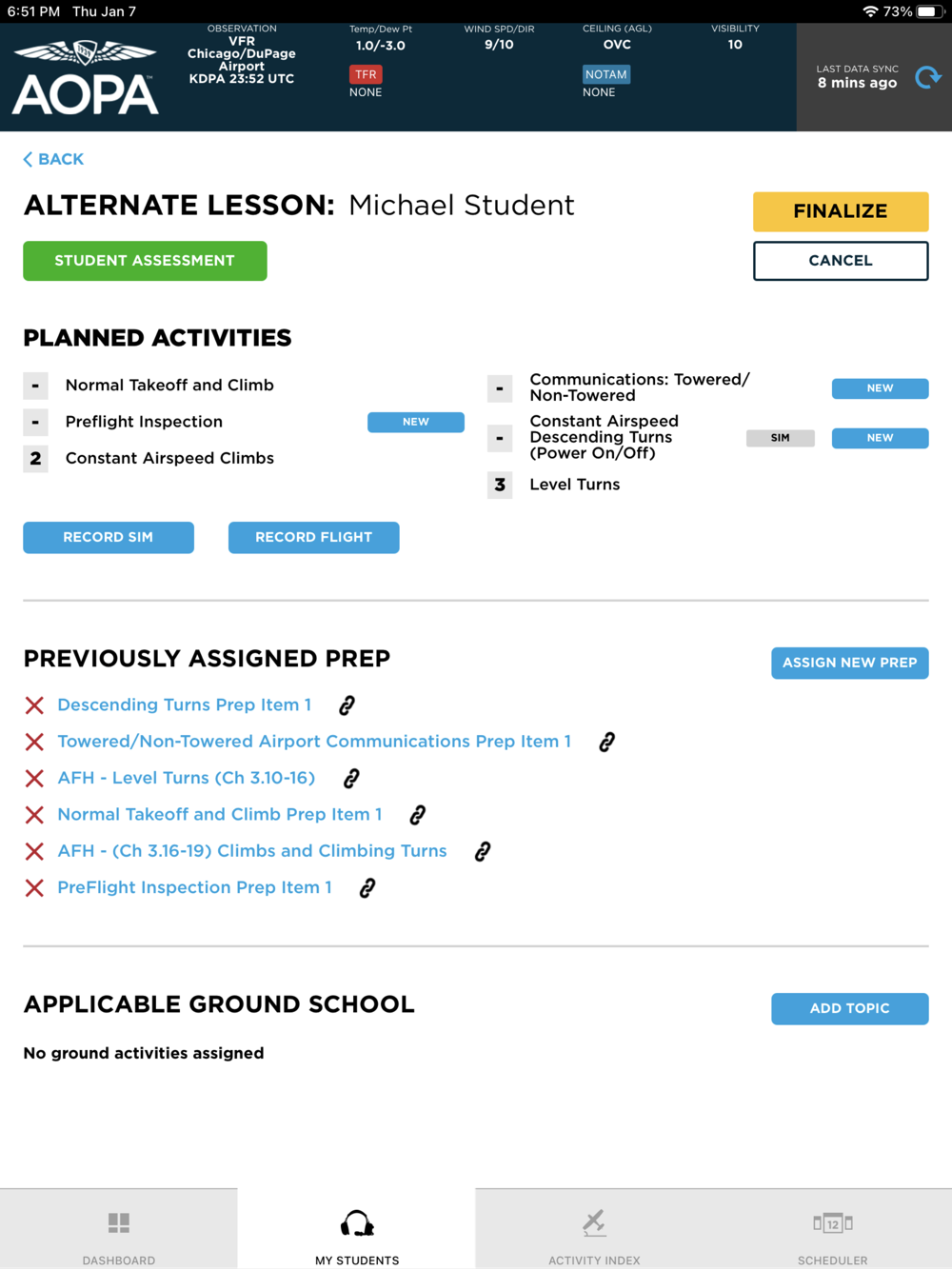 - Copied requirement checkboxes to the Postbrief screen so they accessed there in addition to the Deviate/Record a Flight screen. The checkboxes are: - Night Cross-Country (>100 nm) - One solo cross-country (150 nm total distance, full stop landings.... - Solo takeoffs and full stop landings at an airport with an operating control tower (3 required)- Student filter options now include "All" as an option.- Fix for edge case that could crash the app by viewing the Lesson History tab for a lesson that had all Activities removed prior to Finalizing. The app will now handle this possibility correctly. The Lesson History card will indicate "No activities" in this scenario.
