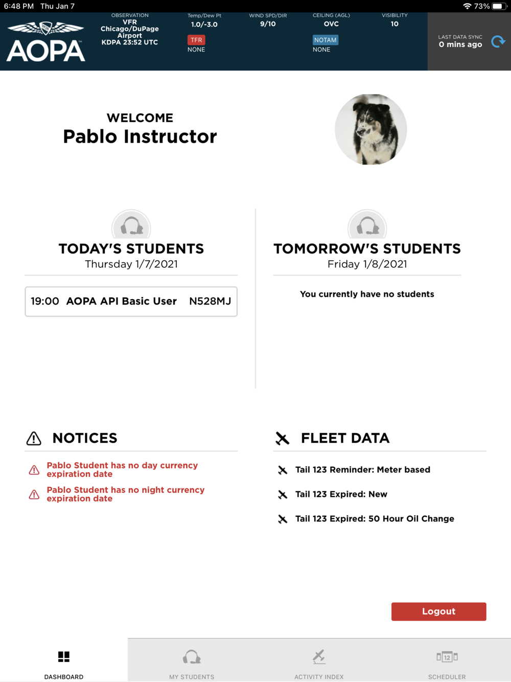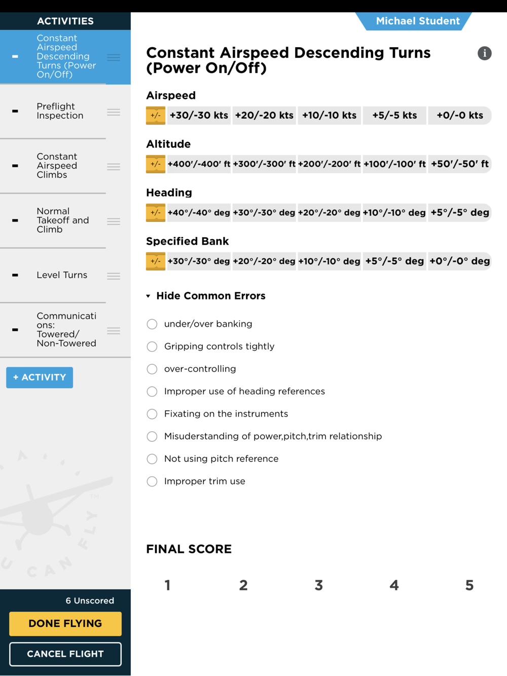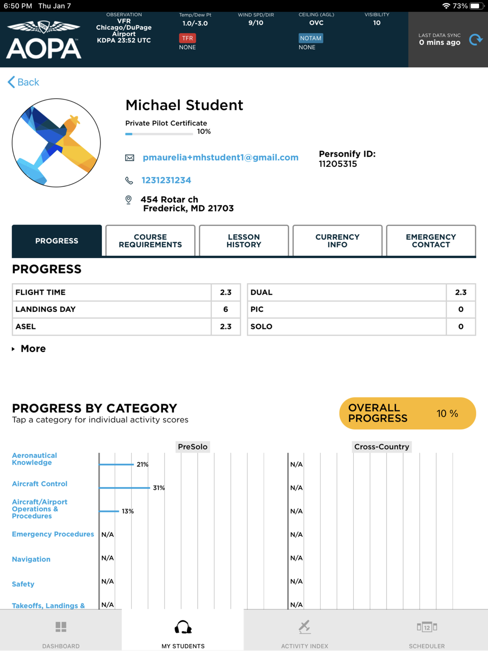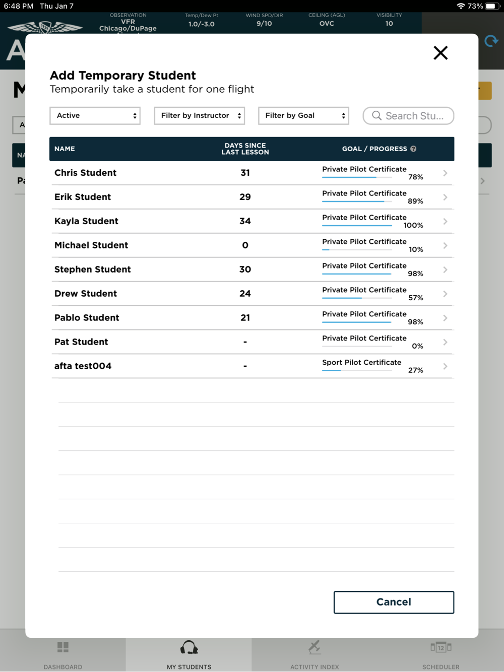 - Copied requirement checkboxes to the Postbrief screen so they accessed there in addition to the Deviate/Record a Flight screen. The checkboxes are: - Night Cross-Country (>100 nm) - One solo cross-country (150 nm total distance, full stop landings.... - Solo takeoffs and full stop landings at an airport with an operating control tower (3 required)- Student filter options now include "All" as an option.- Fix for edge case that could crash the app by viewing the Lesson History tab for a lesson that had all Activities removed prior to Finalizing. The app will now handle this possibility correctly. The Lesson History card will indicate "No activities" in this scenario.