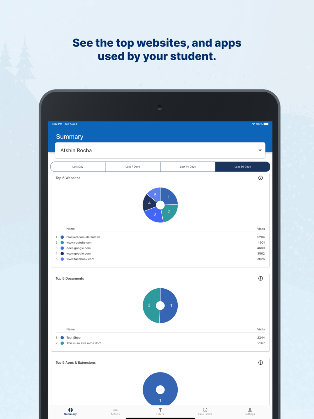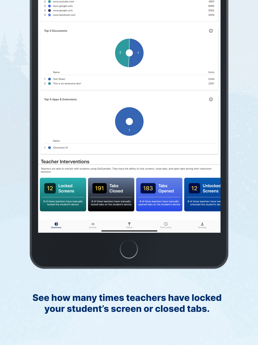See which websites, apps, and extensions your child uses. Gain internet controls for school-issued devices at home. Also, if your child’s school uses GoGuardian Teacher, see how often teachers have issued intervention commands, like locking screens or closing tabs.