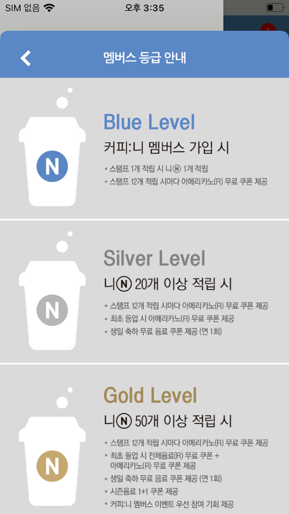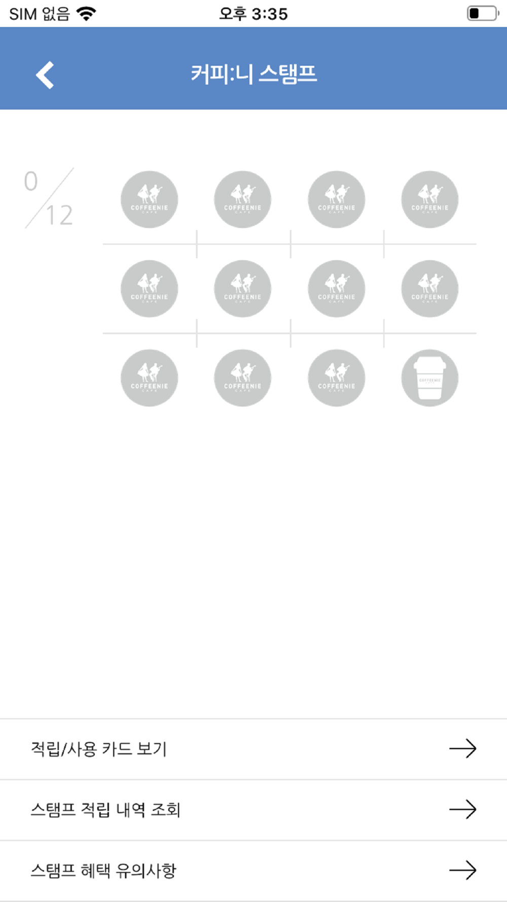 1) 메인 화면: 현재 보유한 스탬프와 니(ⓝ), 쿠폰, 커피:니 카드 현황을 한 눈에 확인할 수 있습니다.