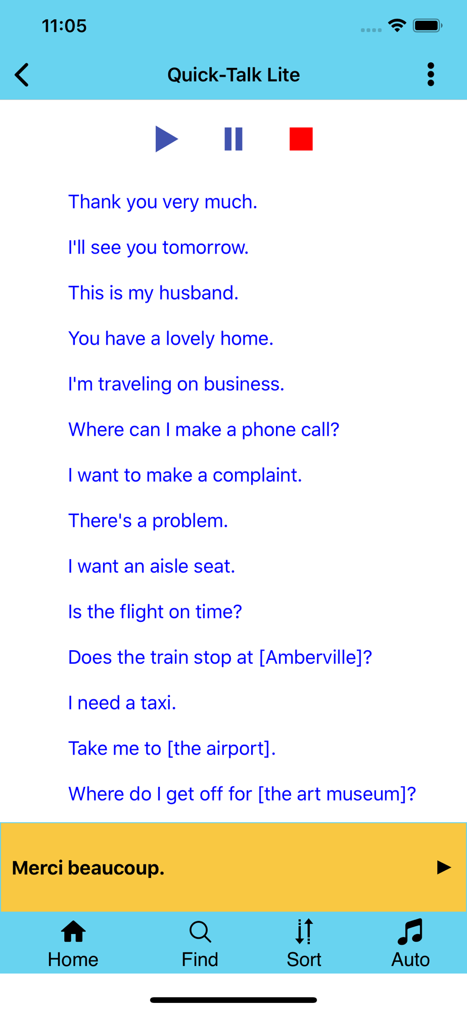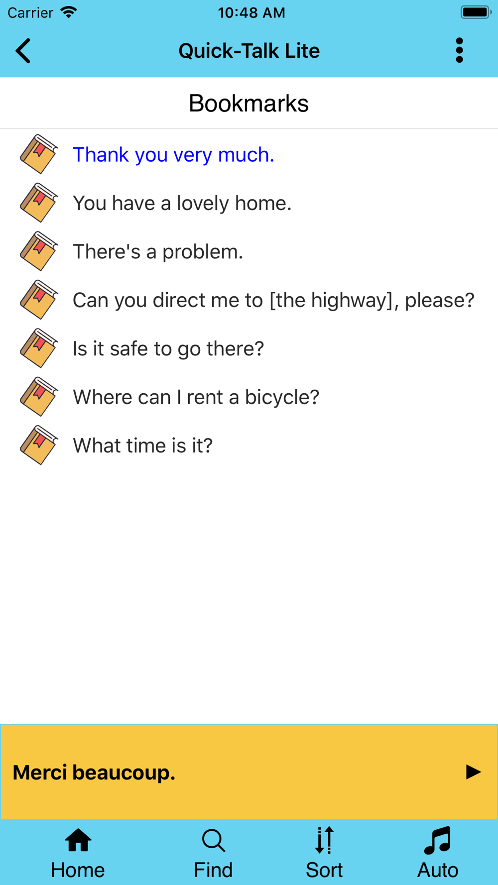 The Quick-Talk Phrasebook provides just the help you need, just when you need it. In a flash, you can choose a phrase in any of five languages, see its translation into any of the others, and hear the translation spoken out loud through your phone’s speaker or earphone. Simply echo what you hear to express yourself with confidence, even if you haven't spoken the language before.