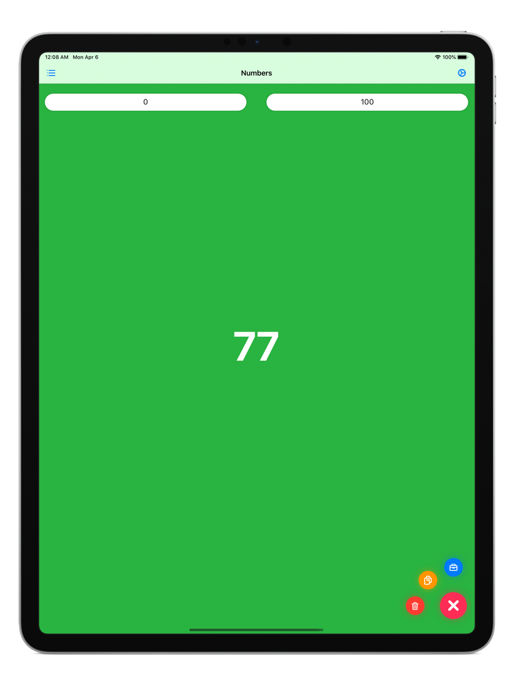 Generate a new random number simply by tapping on screen. Set the minimum or maximum values.