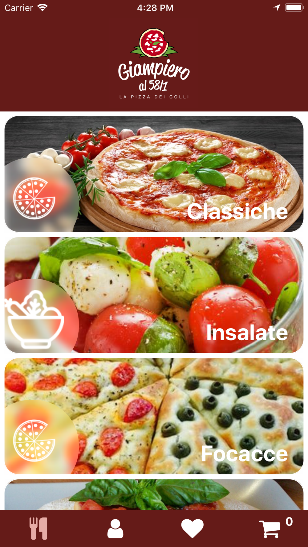 Applicazione mobile per clienti Giampiero al 58 Pizzeria. Con questa app è possibile ordinare deliziose pizze. Tutto a portata di mano.