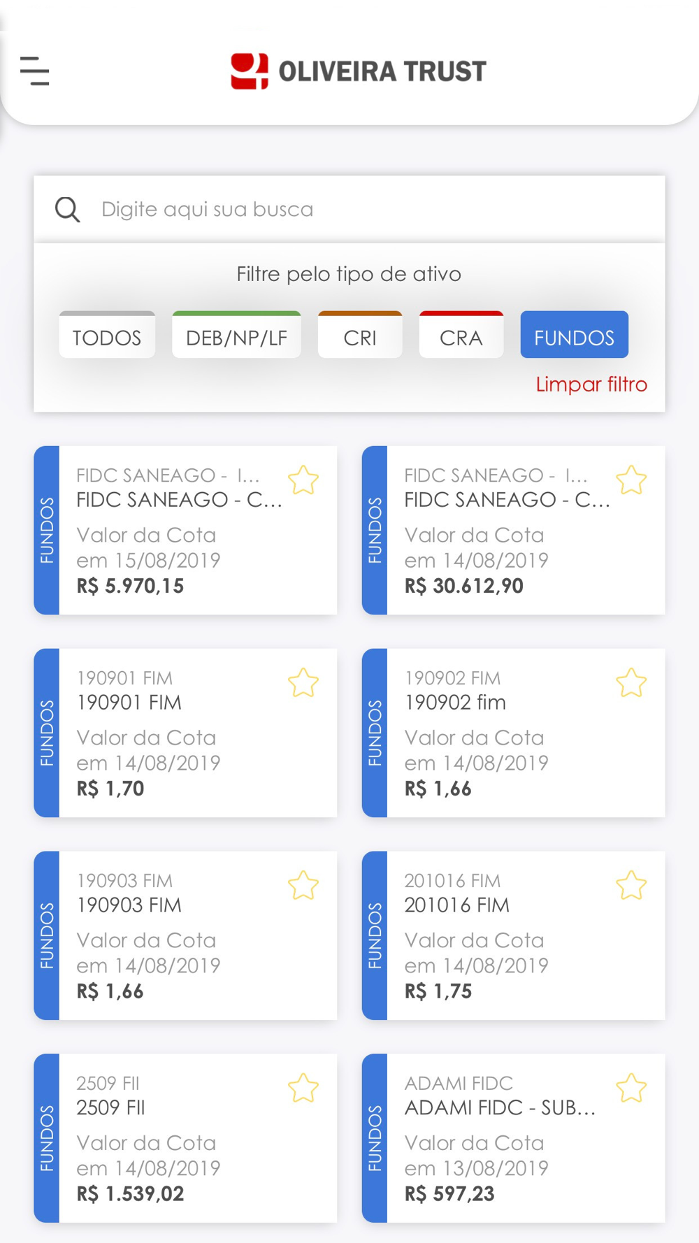 Primeiro App de Agente Fiduciário. Visualize informações dos ativos de sua preferência, como o valor dos P.U.s, cotas de fundos, contratos, documentos, avisos legais e outros. Crie uma lista favorita de títulos com apenas um clique e gratuitamente.