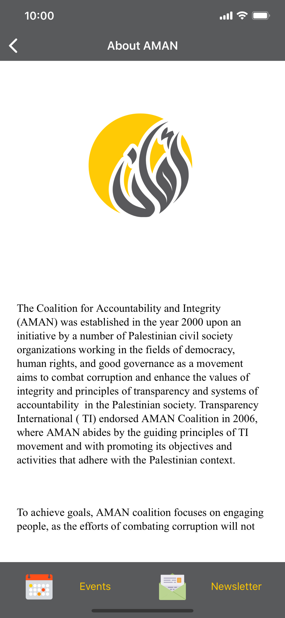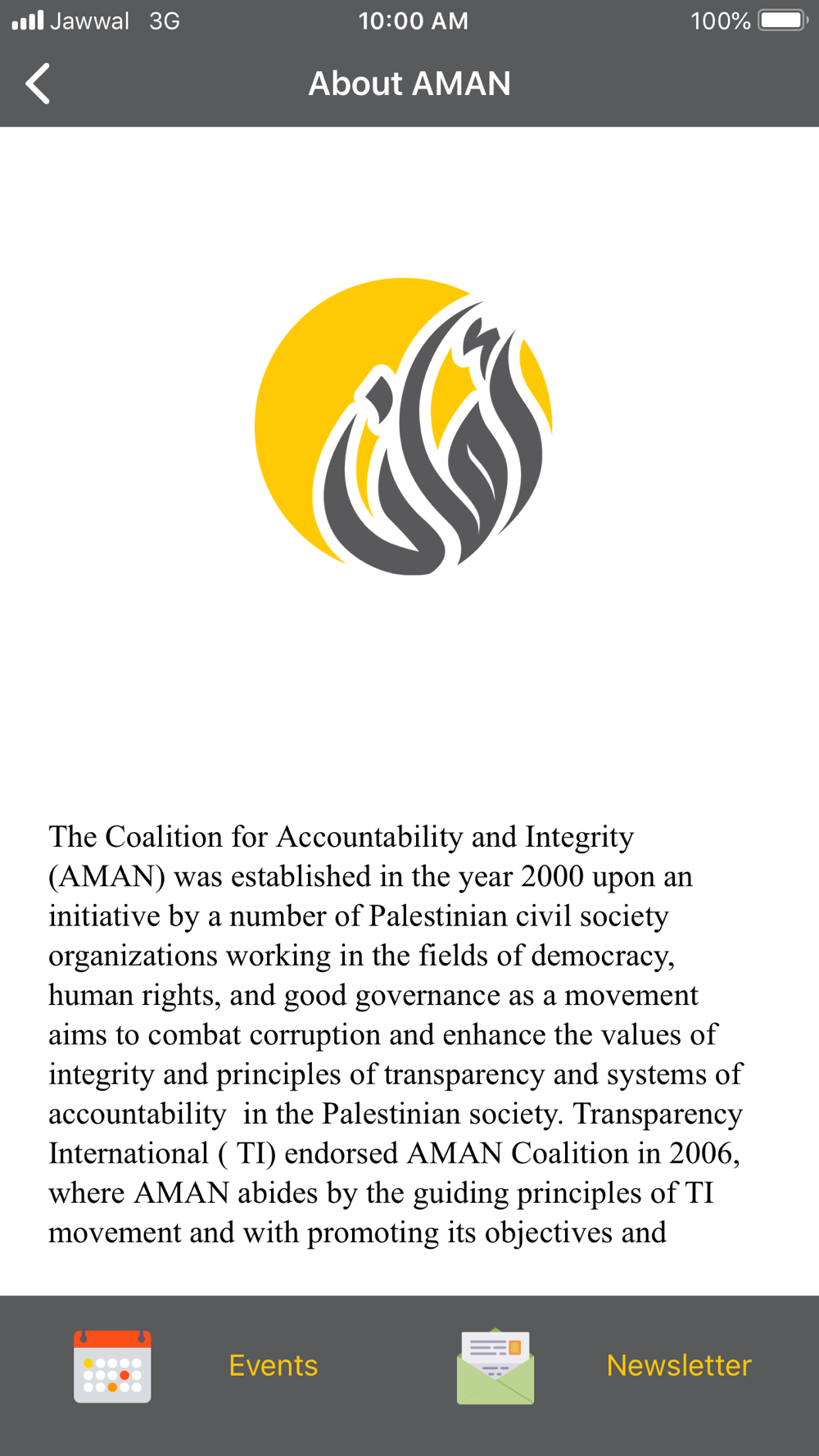 The Coalition for Accountability and Integrity (AMAN) was established in the year 2000 upon an initiative by a number of Palestinian civil society organisations working in the fields of democracy, human rights, and good governance as a movement aims to combat corruption and enhance the values of integrity and principles of transparency and systems of accountability in the Palestinian society. Transparency International ( TI) endorsed AMAN Coalition in 2006, where AMAN abides by the guiding principles of TI movement and with promoting its objectives and activities that adhere with the Palestinian context.