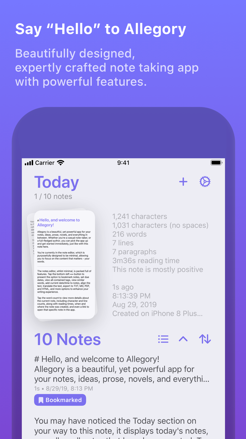 Allegory immediately launches to the clean and simple note editor screen, boosting your productivity and reducing friction between wanting to write down what you’ve just thought of, and actually getting it written down. Support for valid markdown as well as custom markdown makes it easier to create your best work.